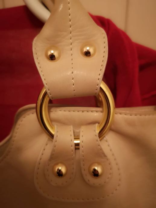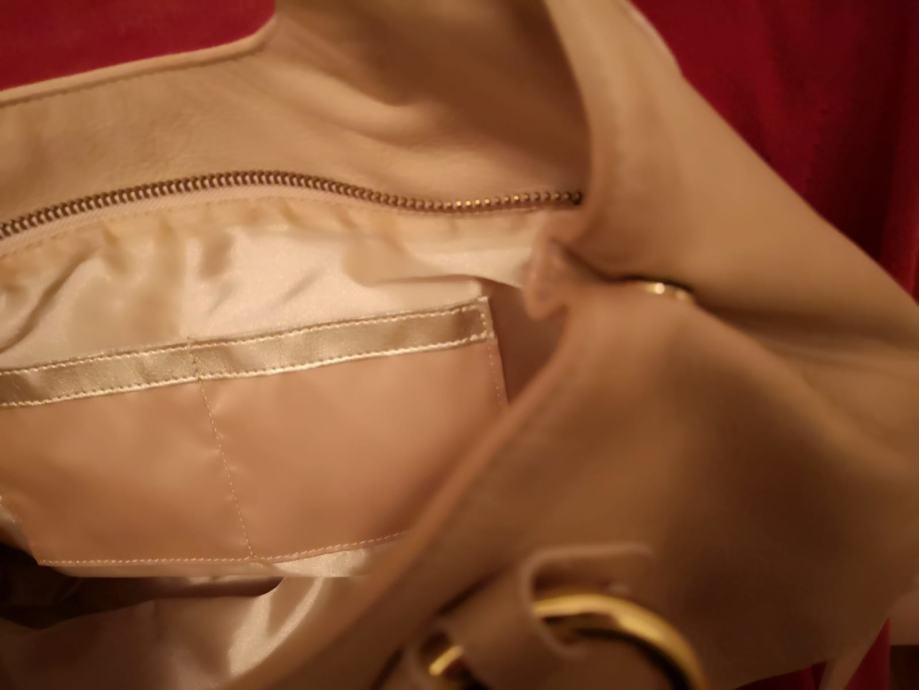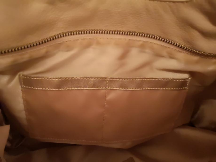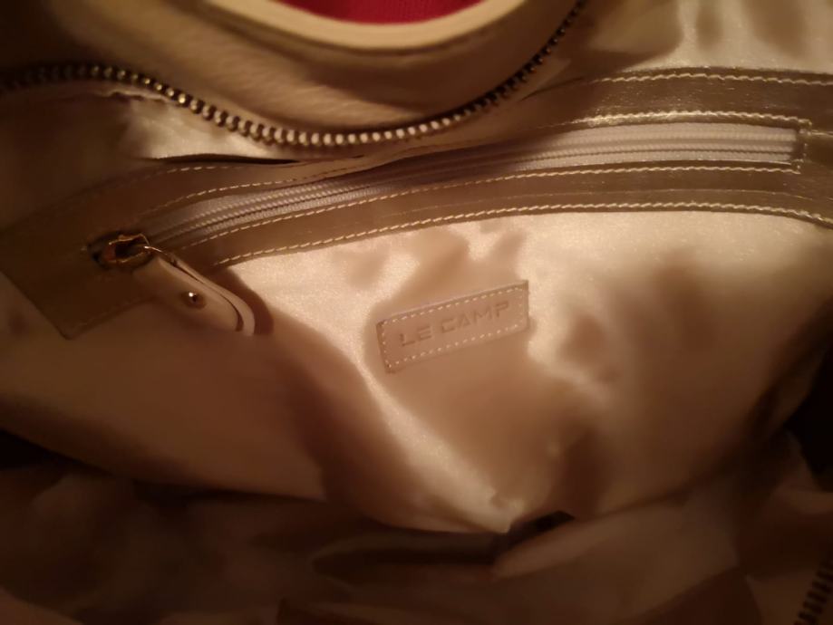 Velika, kvalitetna Le Camp bež kožna torba s ručkama i zasebnim pojasom za nošenje torbe preko ramena. Širina oko 45 cm. Unutarnji veliki džep sa zatvaračem i dva mala na suprotnoj strani. Kvalitetna podstava. Vanjski veliki džep sa zatvaračem na prednjoj strani. Ima dodatni pojas za nošenje poput poštarske torbe.