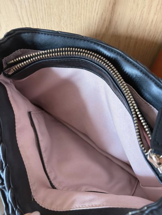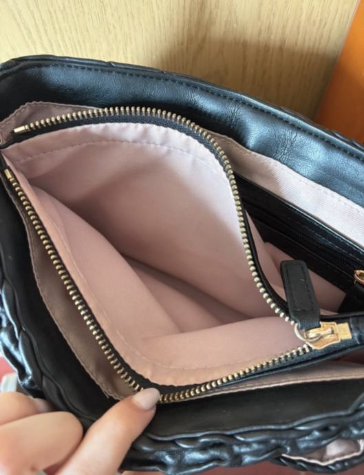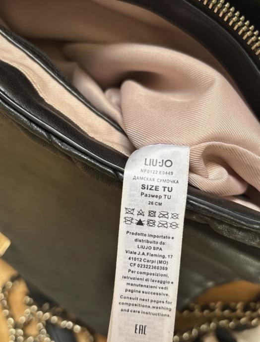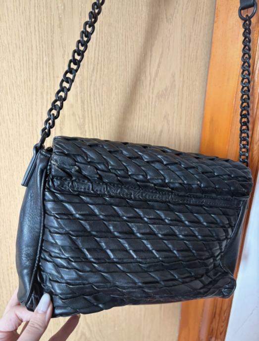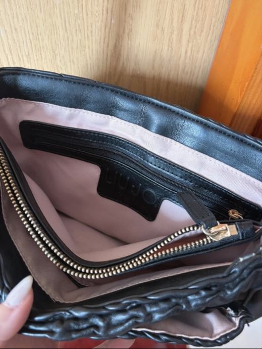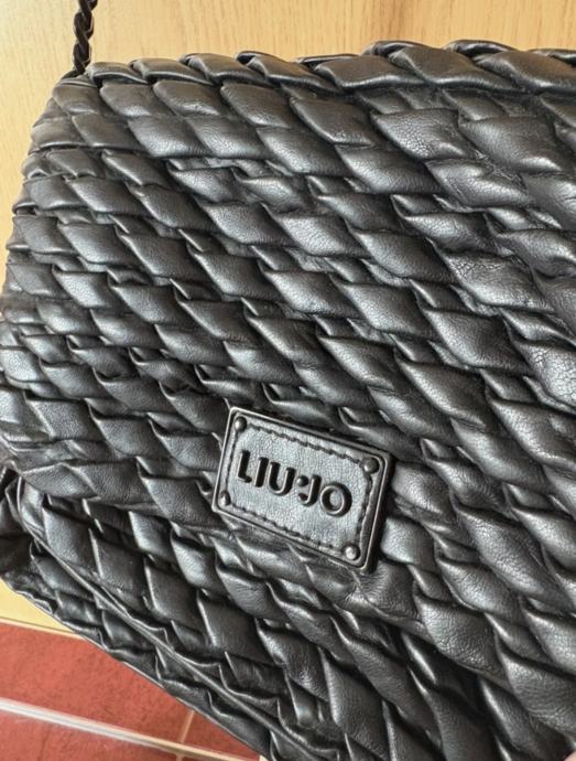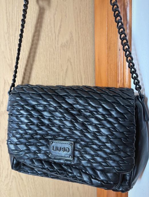 Elegantna ženska Liu Jo torba crne boje s pletenim uzorkom i metalnim lancem za nošenje preko ramena.