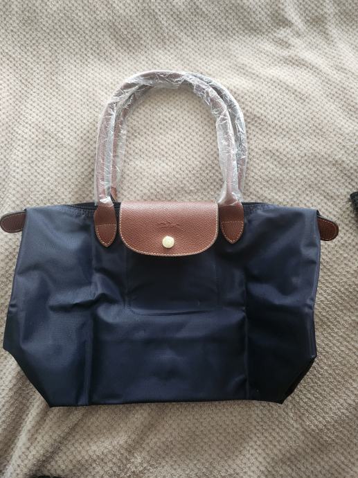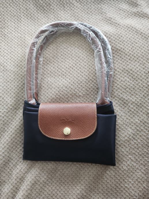 Prodajem Longchamp torbu u tamno plavoj boji s karakterističnim smeđim kožnim detaljima - preklopcem, ručkama i ukrasnom kopčom u zlatnoj boji. Torba je nova bez etikete, ručke su još u zaštitnoj foliji.