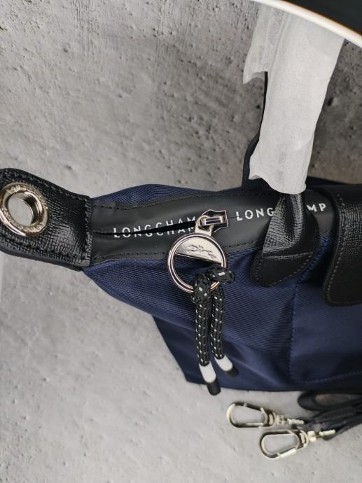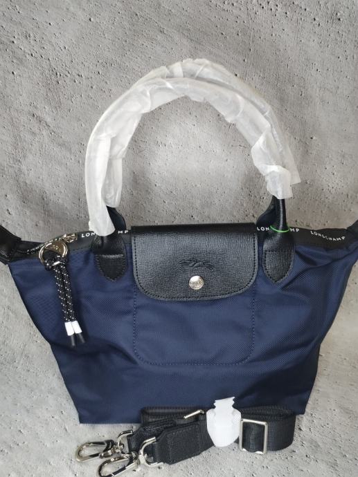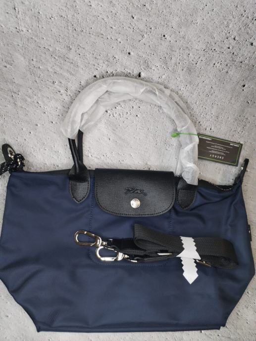 Prodajem Longchamp torbu iz Energy kolekcije, veličina S, potpuno nova s etiketom. Torba je u tamno plavoj boji s crnim kožnim detaljima i srebrnim metalnim okovima. Dolazi s kratkim ručkama za nošenje u ruci te odvojivim i podesivim ramenim remenom, što omogućuje različite načine nošenja. Izrađena od kvalitetnog najlona s karakterističnim Longchamp logotipom na ručkama.