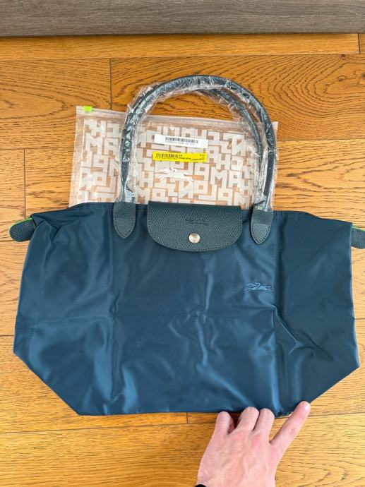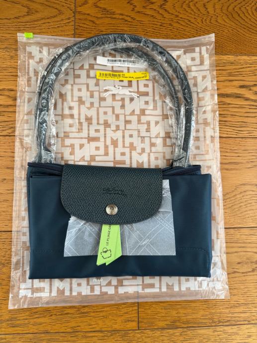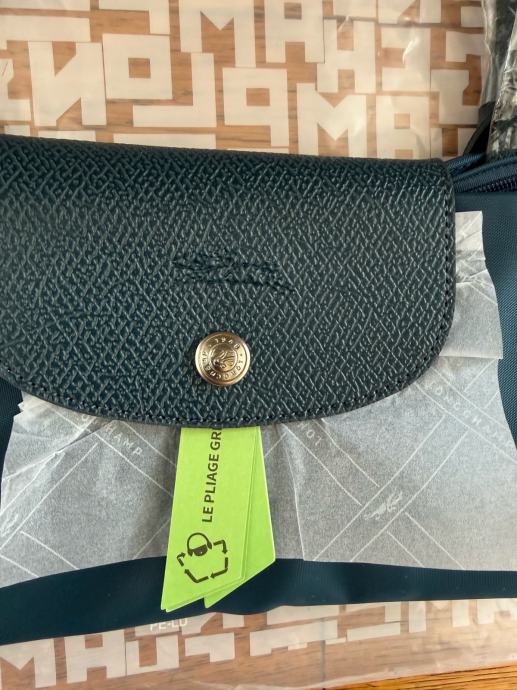 Prodajem Longchamp Le Pliage Green torbu, novu s originalnom etiketom. Torba je tamno zelene boje, izrađena od recikliranog najlona s karakterističnim kožnim preklopom i zlatnim gumbom koji su prepoznatljivi detalji ovog modela. Ručke su kratke, od tamne kože, a torba dolazi u originalnoj prozirnoj zaštitnoj foliji.