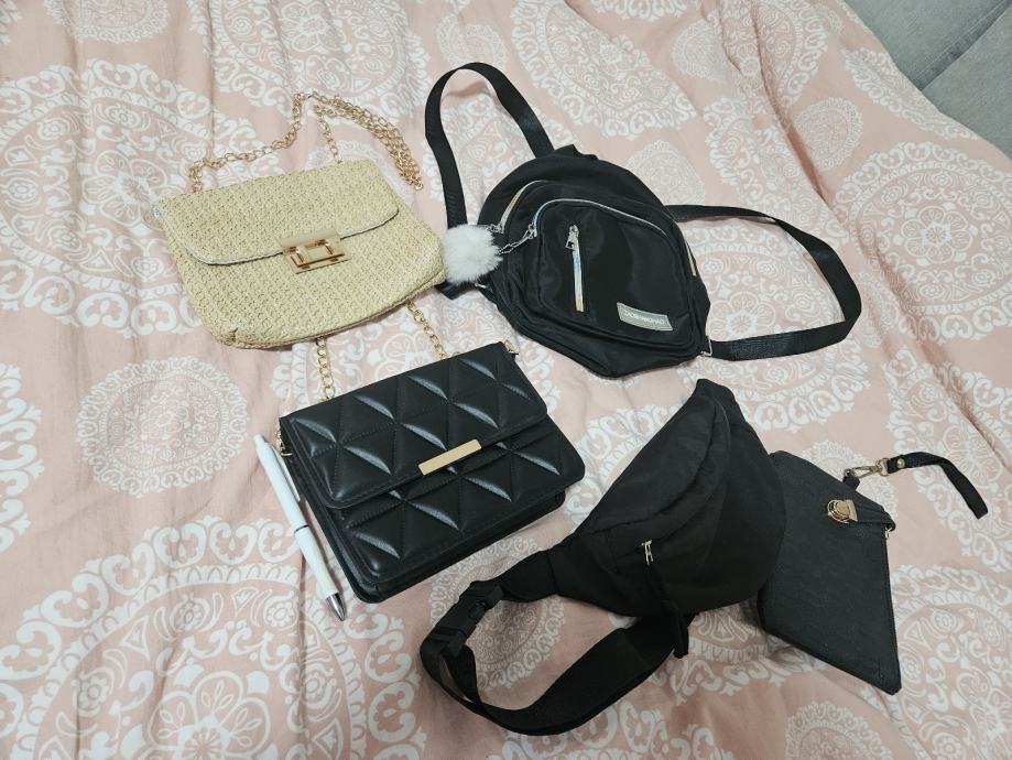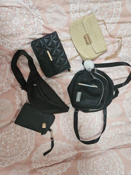 Prodajem torbice sa slike, torbica oko struka i ruksak mini, nošeni su i očuvani ostale tri nisu. Torbice su sve mini , na drugoj slici sam pored jedne stavila kemijsku olovku da se vidi koliko su male