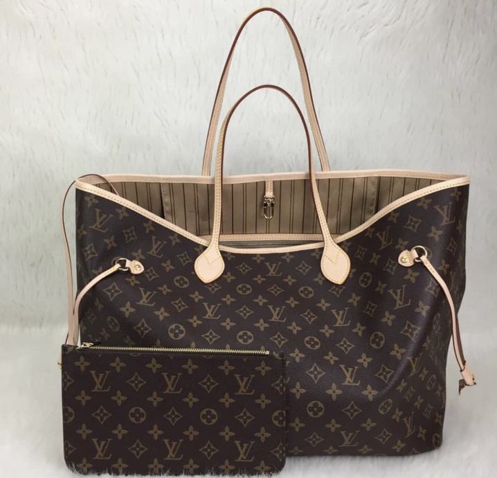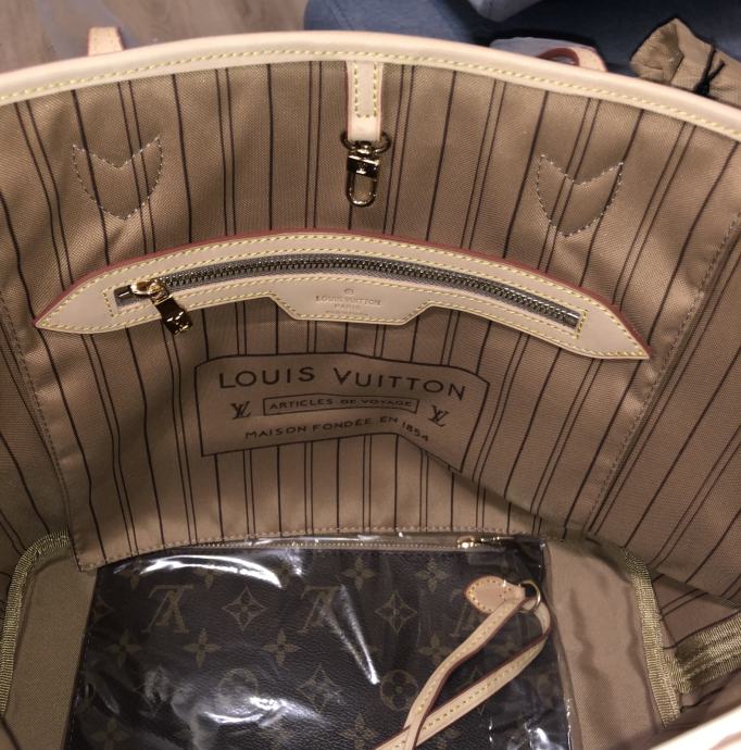 Louis Vuitton Neverfull Monogram torba od prave 100% kože. Kvaliteta torbe je 1:1, dakle vrhunska kvaliteta i najbolje što se može dobiti od ovog modela torbe. Na torbi su i najmanji detalji. Torbica ima serijski broj. Cijena torbe je 250€. Set uključuje: