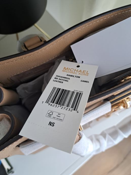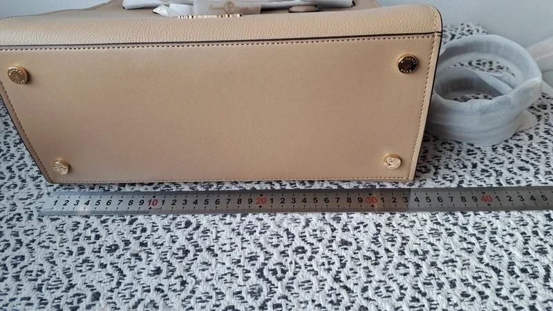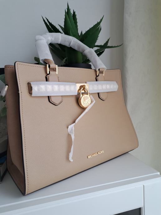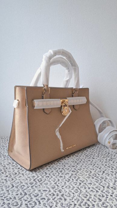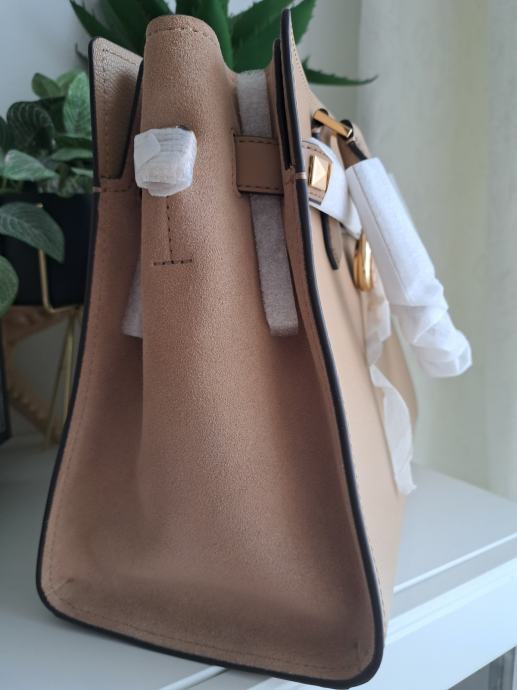 Prodajem novu i originalnu Michael Kors Hamilton Medium ručnu torbu sa zakovicama. Riječ je o rjeđem Hamilton modelu, izrađenom od dvije vrste kože – glatke kože na glavnom dijelu torbe te brušene kože na bočnim stranama, što joj daje dodatnu dimenziju i vrlo profinjen izgled. Diskretne zakovice naglašavaju dizajn, a da pritom ostaje elegantan i bezvremenski. Neutralna bež/nude boja čini ovu torbu savršenim izborom za svaku kombinaciju i sve sezone