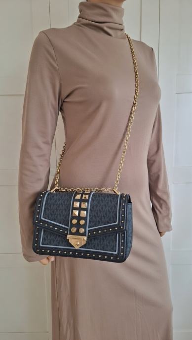 Michael Kors SoHo Large Studded Logo Admiral Blue Shoulder Bag torbica. Prepoznatljiv monogram uzorak, zlatne zakovice i duboka admiral plava nijansa. Veći model koji je dovoljno prostran, a zadržava chic siluetu. Trenutno rasprodana i teško dostupna. Dolazi s karticom autentičnosti.