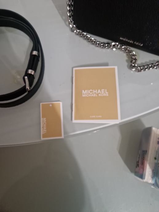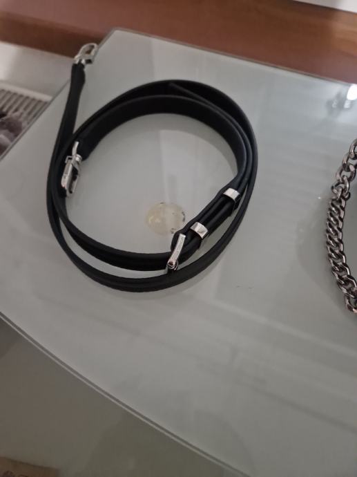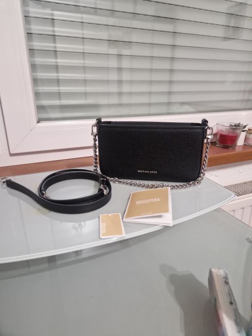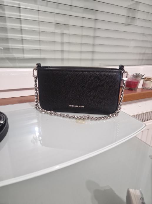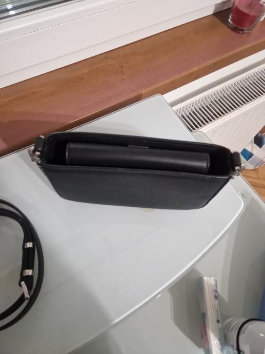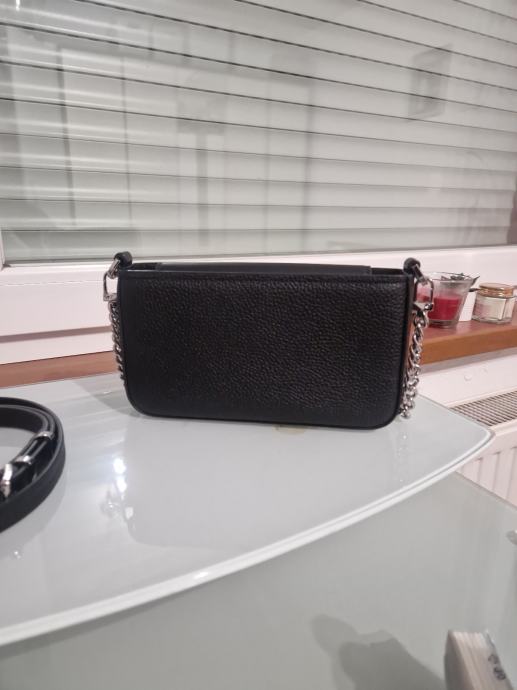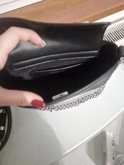 mala,crna torbica, vanjski materijal koza, podstava od tkanine, zatvara se na magnet,ima glavni pretinac i utor za pohranu, ima 2 remena crni dugački kožni i srebrni lanac koji je za preko ramena što omogućuje razne mogučnosti nošenja, visine 11cm, duljine 20cm i širine 4cm, ručka za nošenje 21cm, uzorak je jednolican, cijena nije fiksna, otvoreni smo za dogovor i prilagodbu cijene