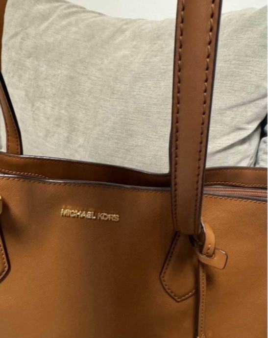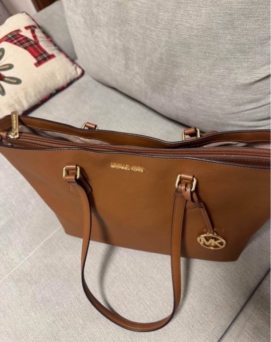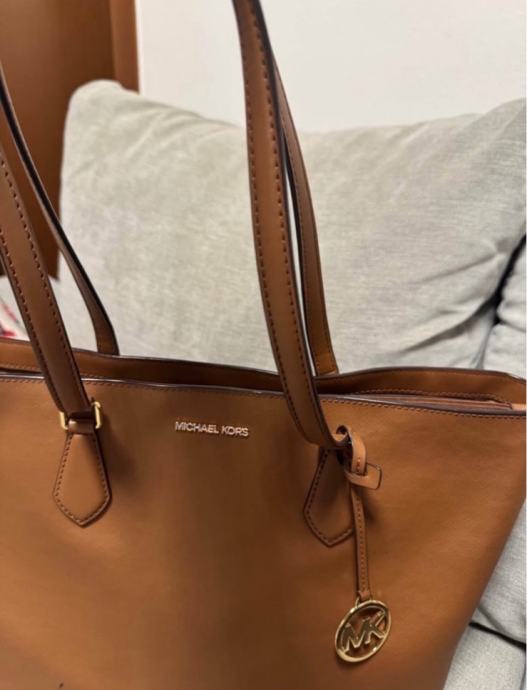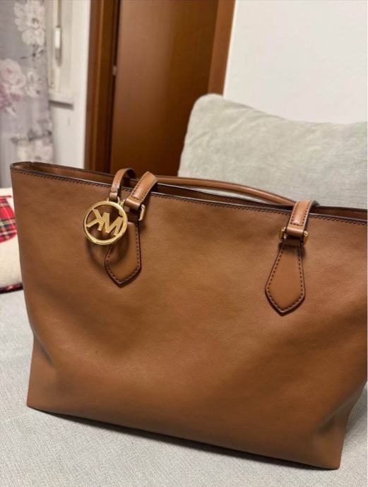 Prodajem rabljenu Michael Kors torbu u smeđoj boji s prepoznatljivim MK privjeskom. Elegantna i prostrana torba savršena za svakodnevne prilike ili posao. Klasičnog je dizajna s praktičnim ručkama i kvalitetnom kožom koja pokazuje minimalnu istrošenost. Plaćena 250€. Nema tragova nošenja.