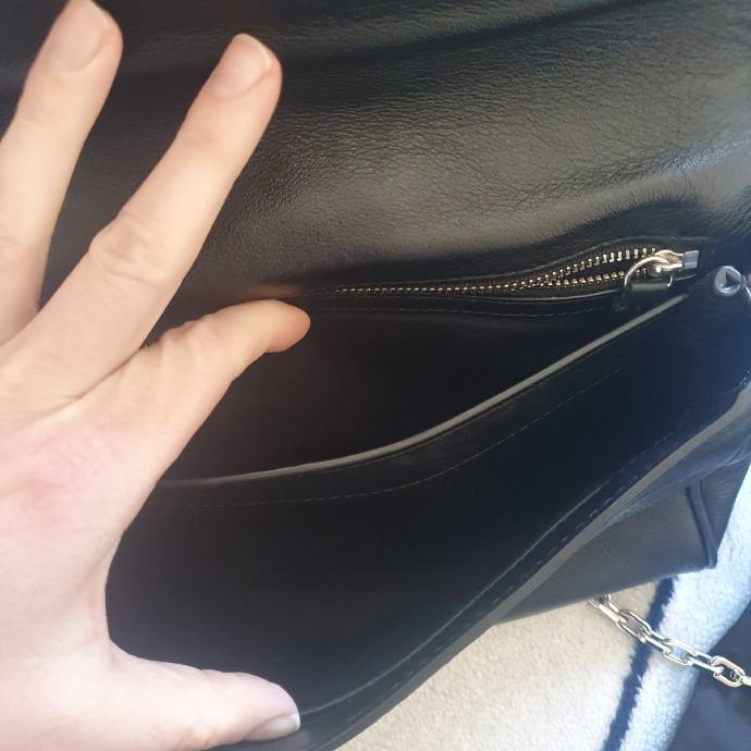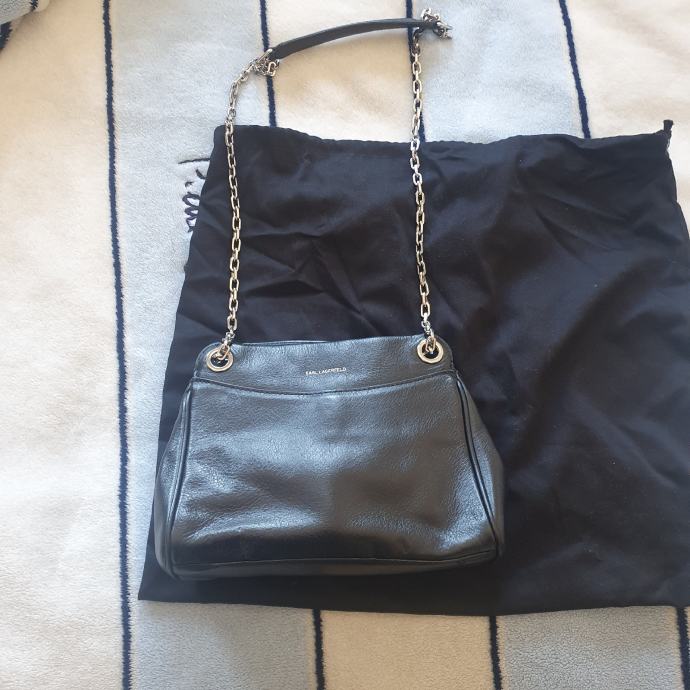 Original Karl Lagerfeld crna kožna torba. Uz nju dolazi dustbag i kartica autentičnosti. Koštala 3000kn, mislim da imam i račun i etiketu negdje. Lanci su podesivi pa se može nositi na ramenu ili preko ramena . Širina pri vrhu 24cm, širina pri dnu 25cm, visina 19cm. Zatvaranje na magnet. Sa stražnje strane isto ima jedan džep na magnet. Iznutra ima jednu pregradu na sredini i jedan džep na cif. 100% goveđa koža. Jedina mana je ova jedna sitna točkica koja se nalazi sa unutarnje gornje strane uz rub i nije vidljiva dok se ne rastvori taj dio. Cijena sa slanjem 152 eura, osobno preuzimanje 150 eura. Osobno preuzimanje ISKLJUČIVO na Cvjetnom trgu(možete tamo i isprobati u nekom od dućana), trgu ili na Mihaljevcu.