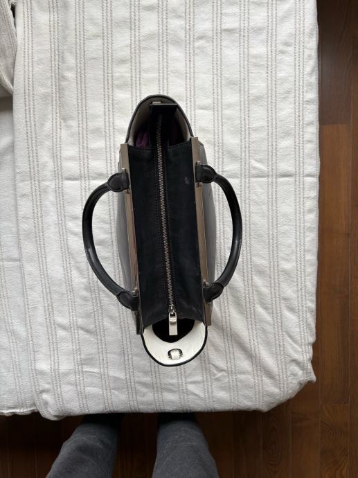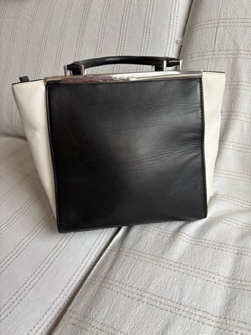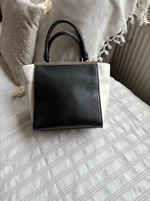 Prodajem originalnu Michael Kors torbicu izrađenu od prave kože. Torba je u kombinaciji crne i bijele boje s metalnim detaljima u srebrnoj boji. Ima dvije ručke za nošenje te strukturiran, čvrst oblik koji zadržava formu. Zatvaranje je na patent, a unutrašnjost je prostrana s crnom postavom. Dno torbe zaštićeno je malim metalnim nogicama. Za sve prilike.