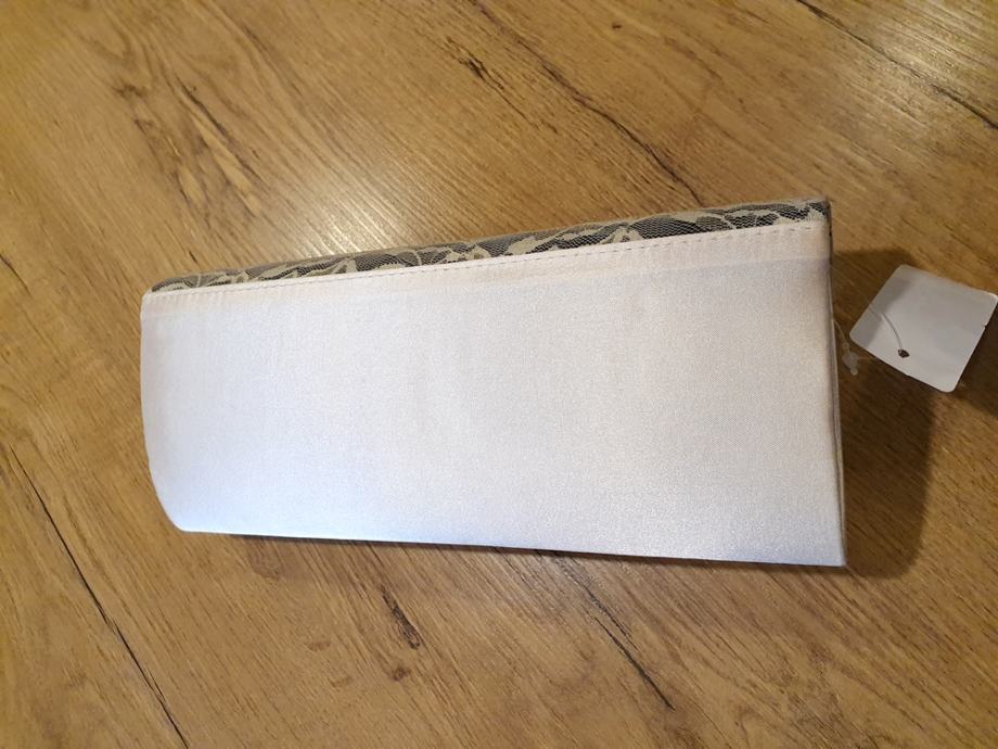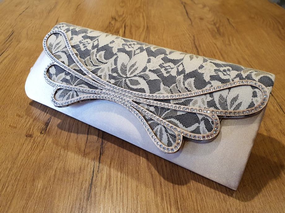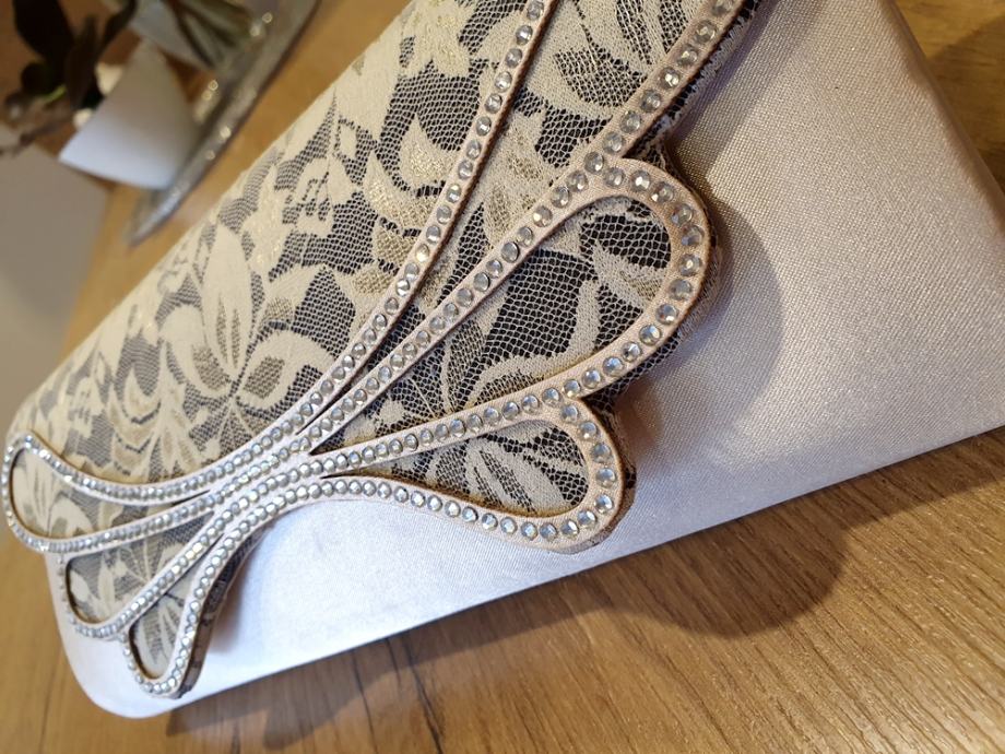 Champagne boja, svilenkaste teksture, gornji dio sa cipkom i cirkonima.