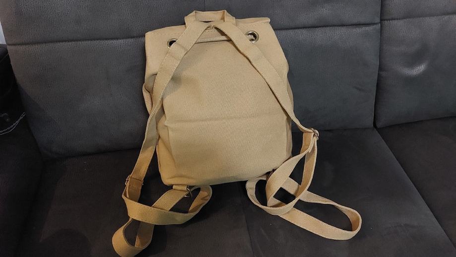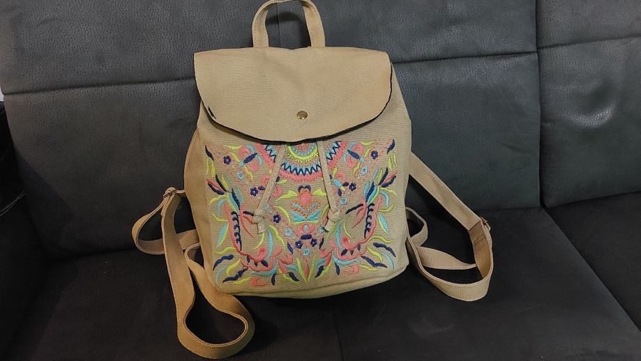 Novi platneni ruksak ,bež boje, srednje veličine, sa prekrasnim šarenim vezovima