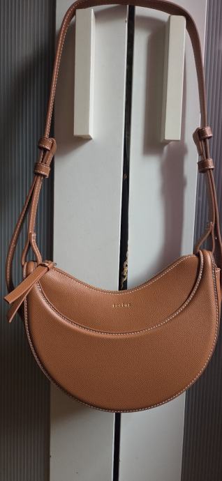 Prodajem Polène Numéro Dix torbicu u camel boji. Radi se o prepoznatljivom polumjesečastom modelu s podesivim remenom koji se nosi preko ramena ili tijela. Torba je izrađena od teksturirane veganske kože s karakterističnim čvorovima na remenčiću i zlatnim metalnim detaljima. Unutrašnjost je prostrana s patent zatvaračem. Stanje je novo bez etikete.