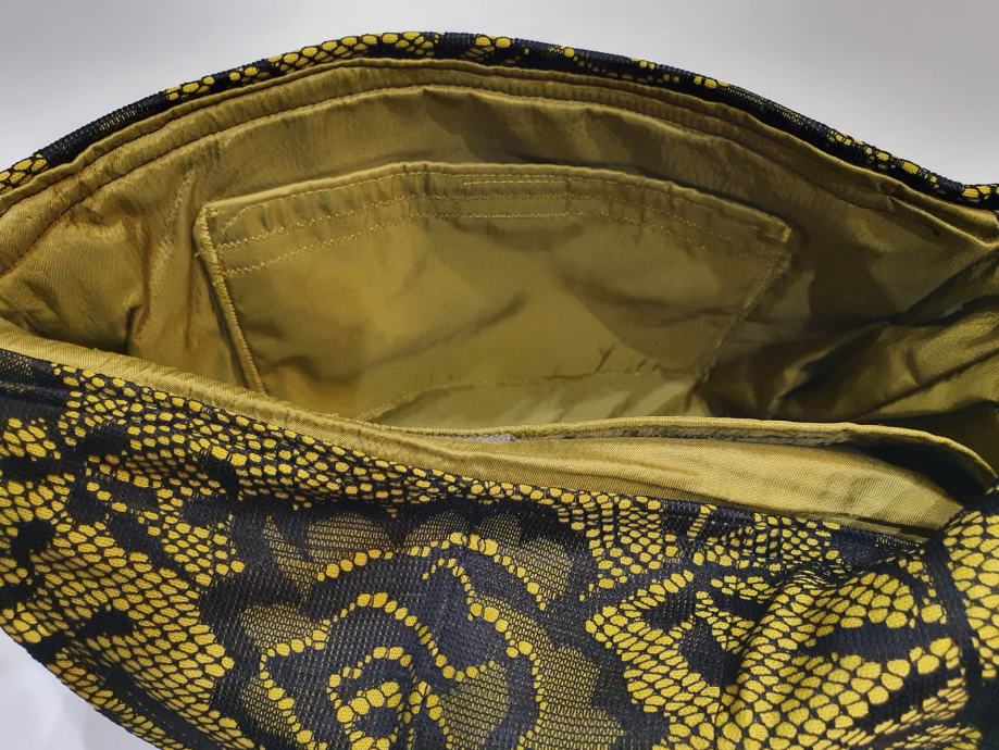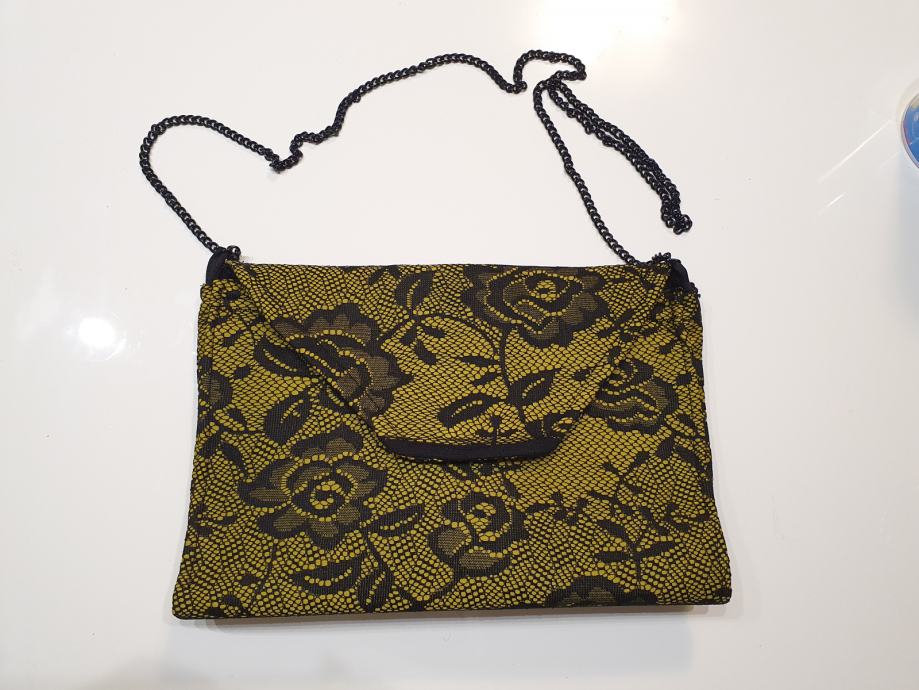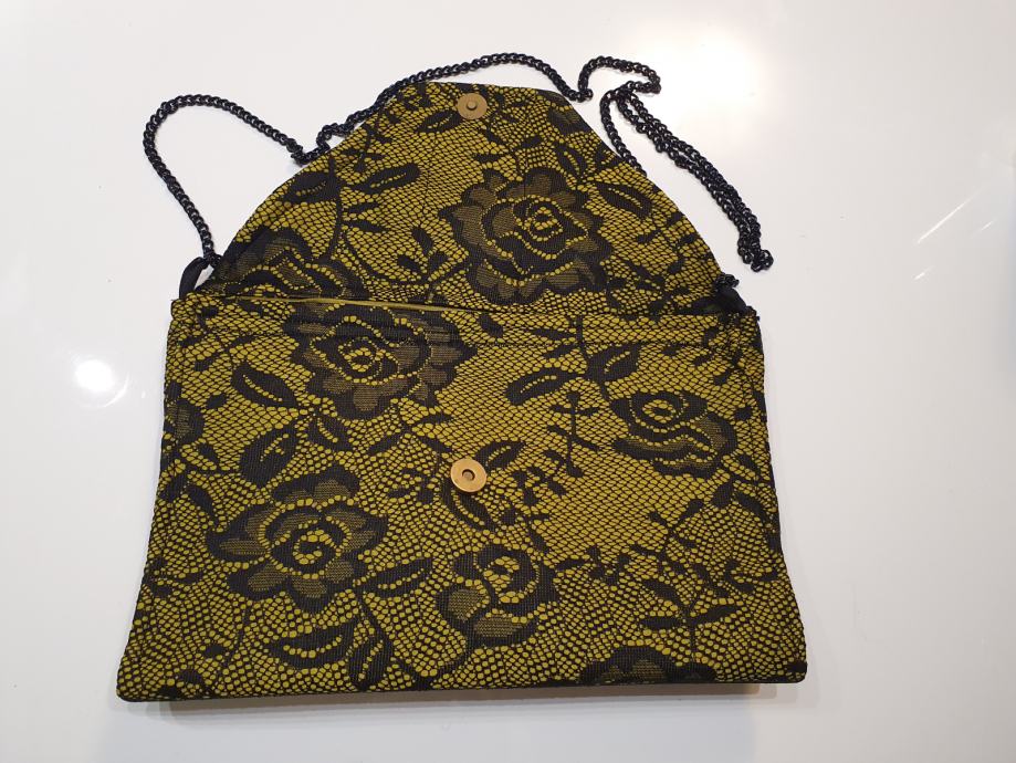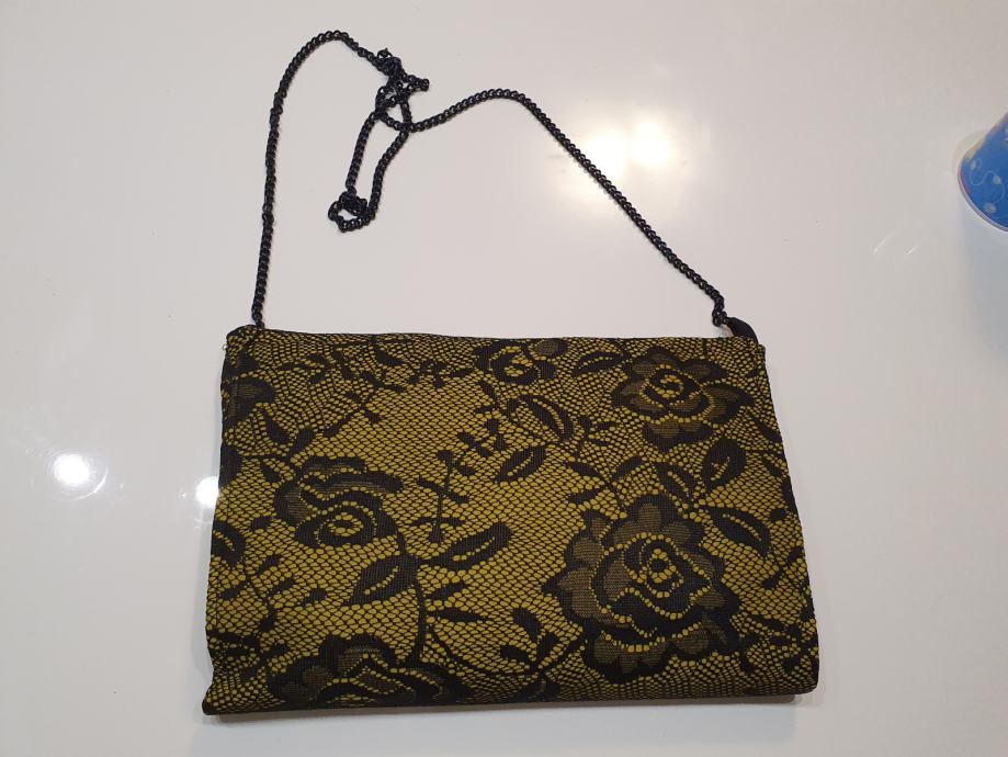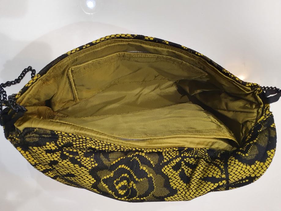 Predivna ženska torbica žuto zelene boje presvucena crnom čipkom. Nosiva na rame a remen odnosno lanac se može spremiti unutra i nositi u ruci.
