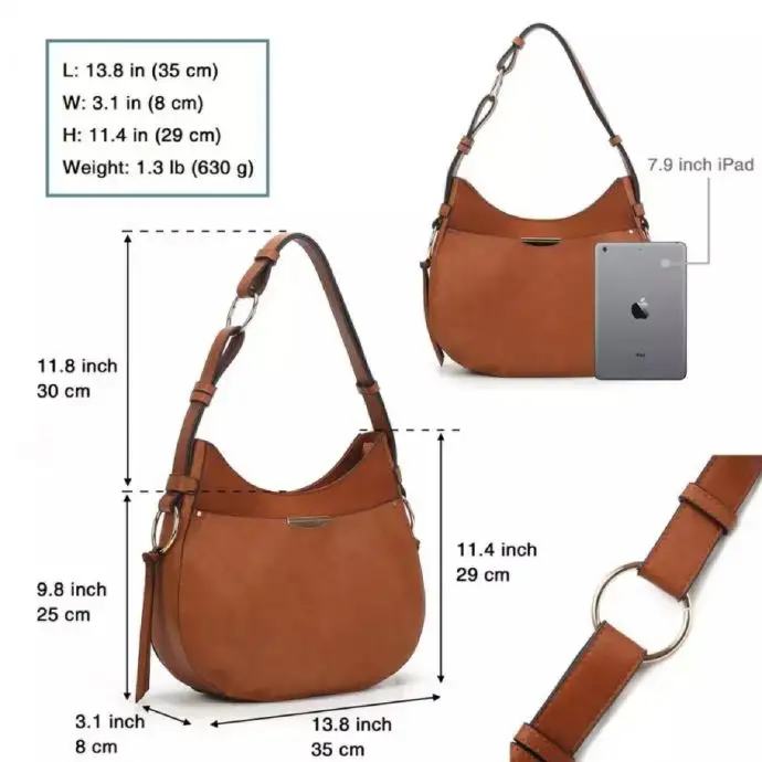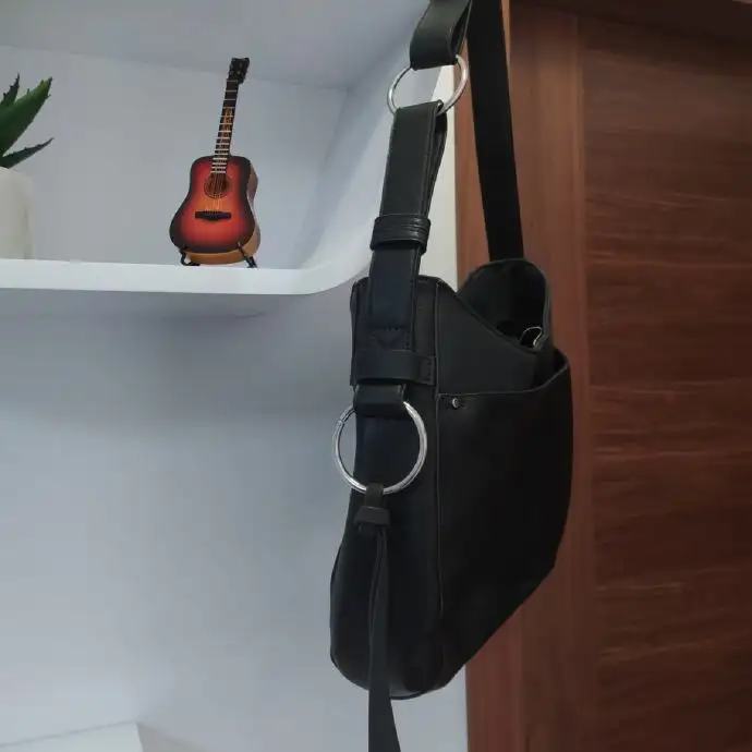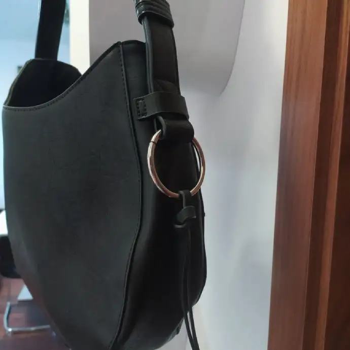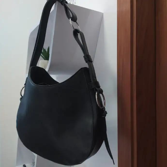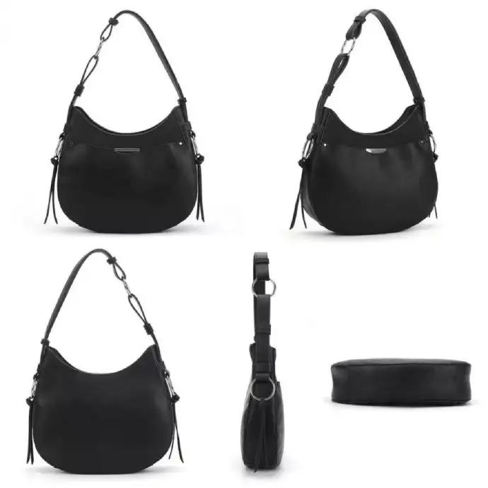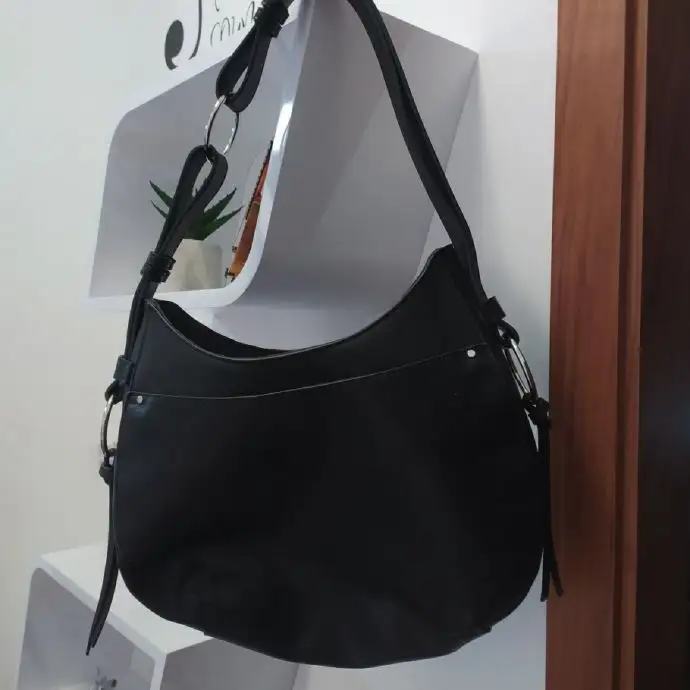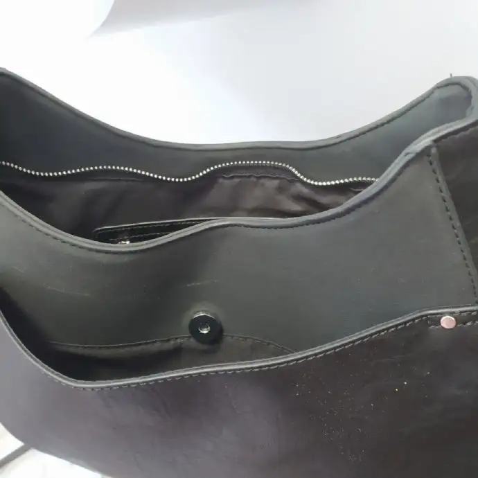 Prodajem novu crnu žensku hobo torbu od umjetne (čvrste) kože. Ima glavni srebrni zatvarač, sa bočne strane ima veliki pretinac na magnet zatvarač, unutra ima bočni pretinac sa ciferšlus zatvaračem, pretinac za mobitel i šminku. Dimenzije su prikazane na slici.