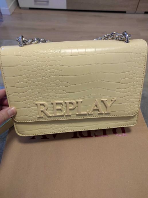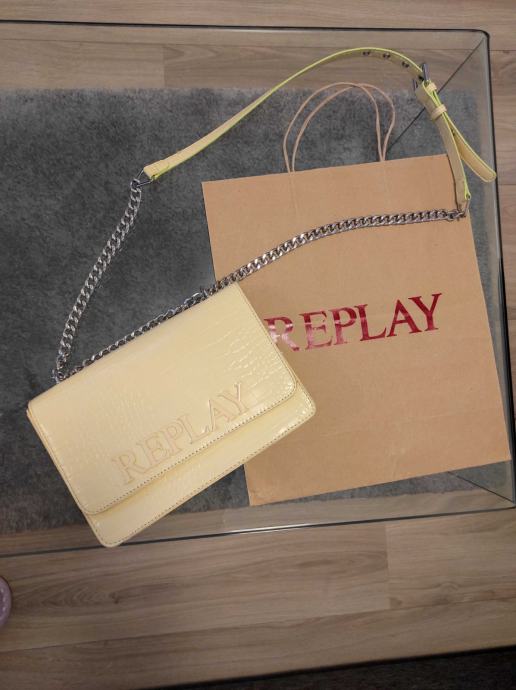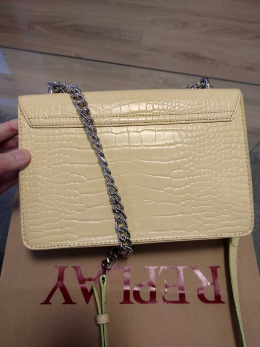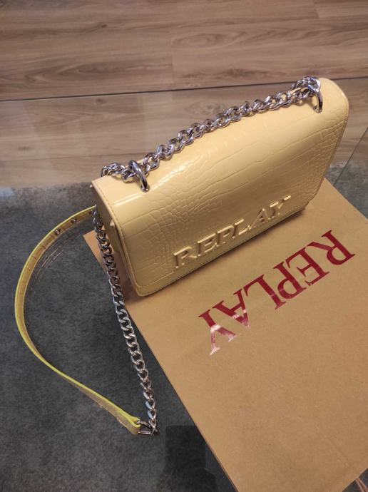 Iconic Replay torba u žutoj boji, kroko uzorak, zatvaranje na prekolop i magnet, metalni Replay natpis sprijeda, podesivi metalni lanac za nošenje na ramenu, s detaljem od istog materijala kao torba. Dimenzije: dužina 25 cm, visina 17 cm, širina 7 cm.