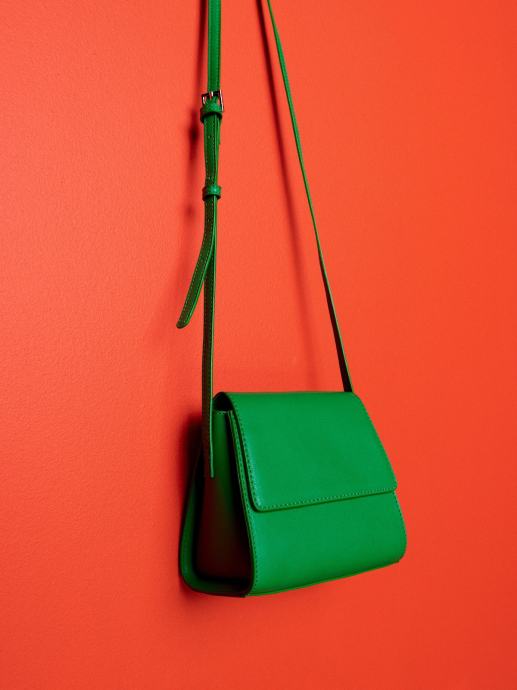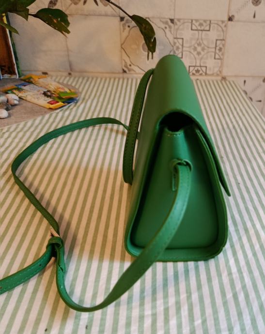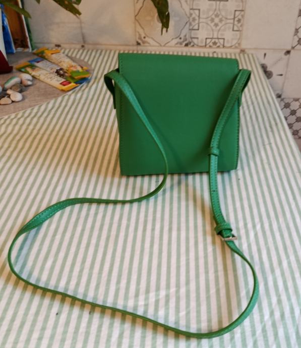 Reserved mala zelena torbica. Izrađena je od umjetne kože sa strukturiranim, pravokutnim dizajnom i ima podesivi remen za nošenje preko tijela ili ramena.