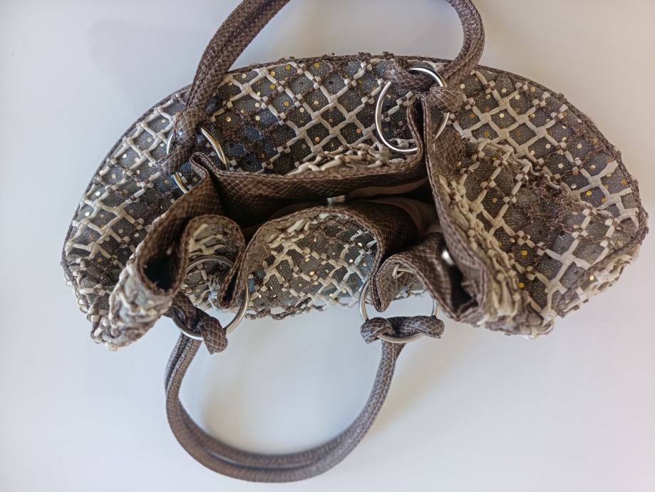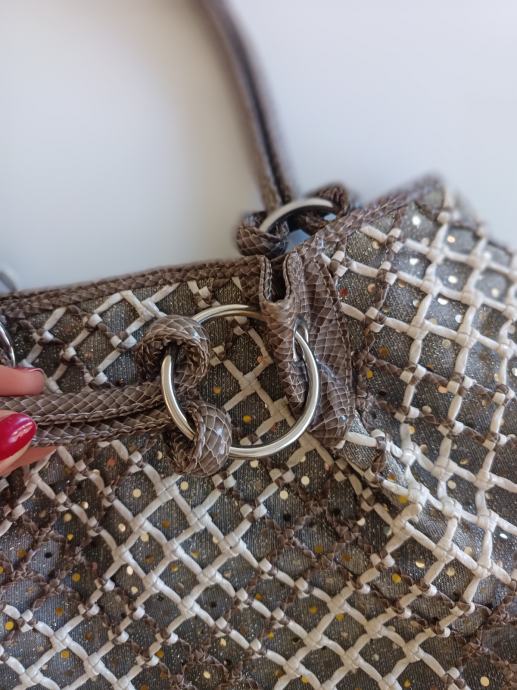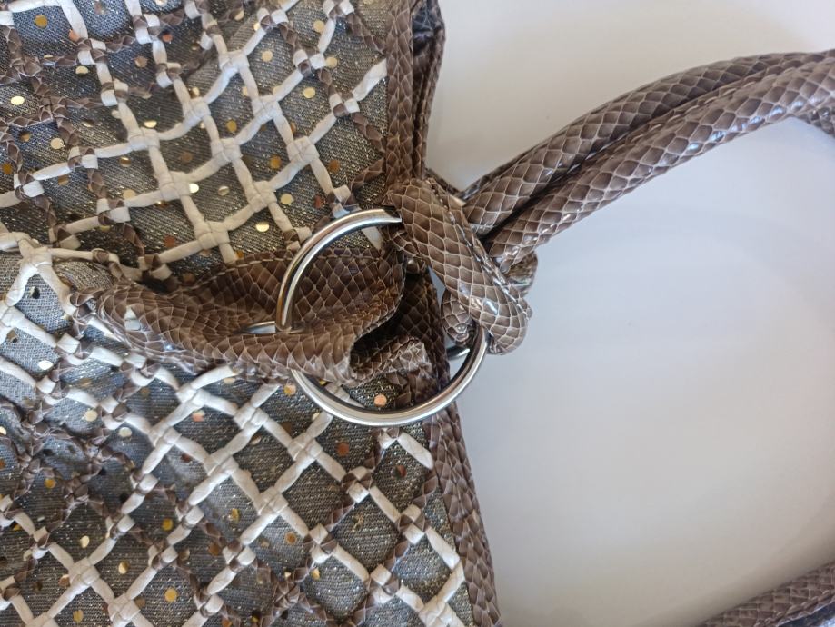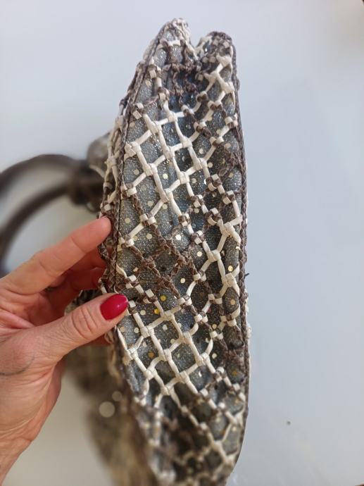 Elegantna ženska handbag torba RIEKER izrađena od kombinacije poliesterskog platna, isprepletenih kožnih niti, i ručki fiksiranih metalnim alkama.