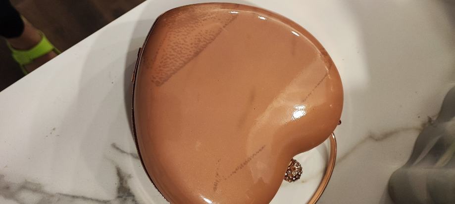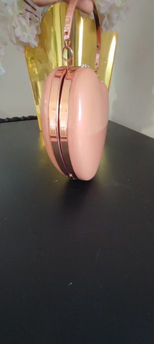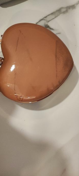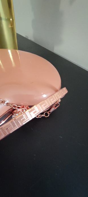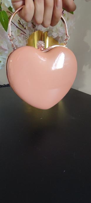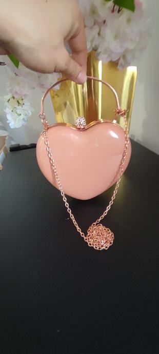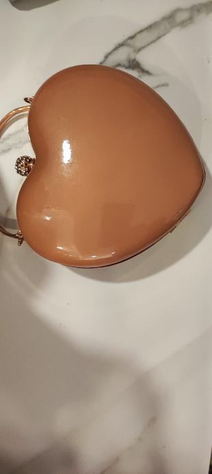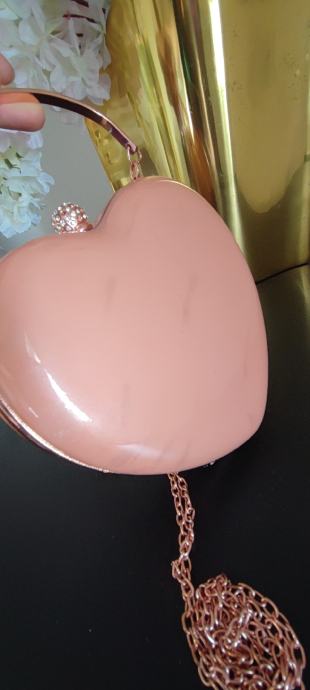 Prodajem torbicu u obliku srca, rose gold boje sa dodatkom ručke i ukrasne kopče sa cirkonima. 10 cirkona nedostaje ali se ne primjeti. Može se nositi u ruci za ručku ili sa lancem preko tijela. Dolazi sa odgovarajućim lancem. Torbica je nošena na četiri svečane prigode, i nigdje više, mada nije napadna i moguće ju je iskombinirati i na dnevni look. Tragovi nošenja samo s jedne strane od stajanja.