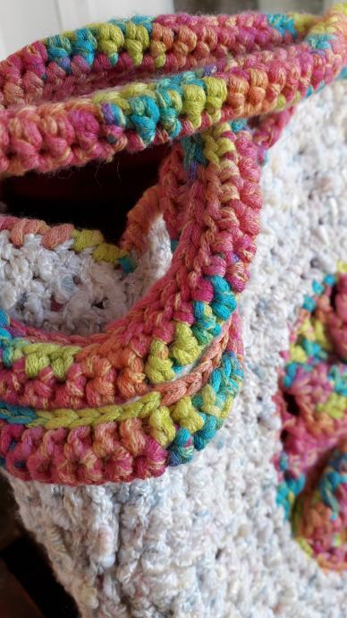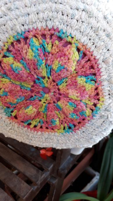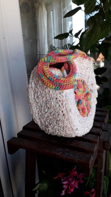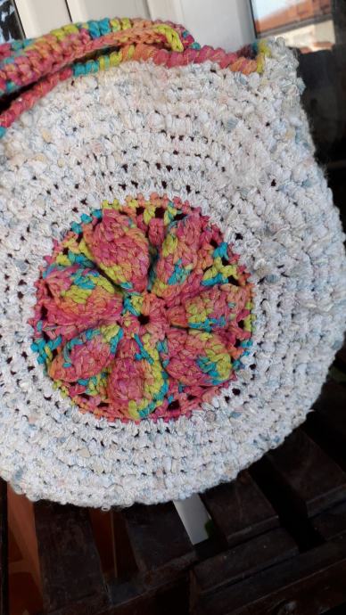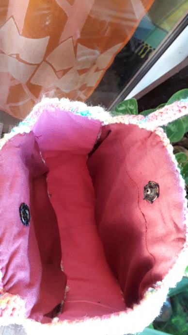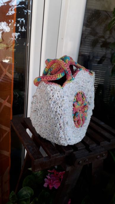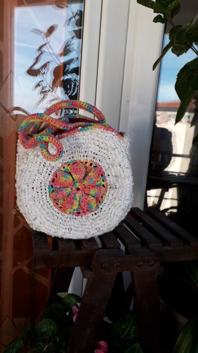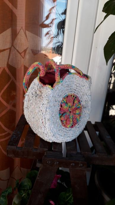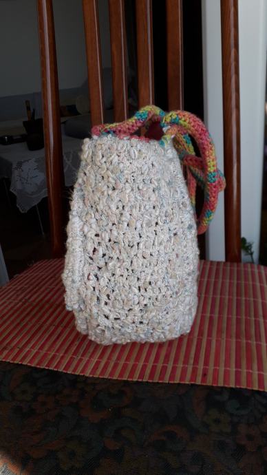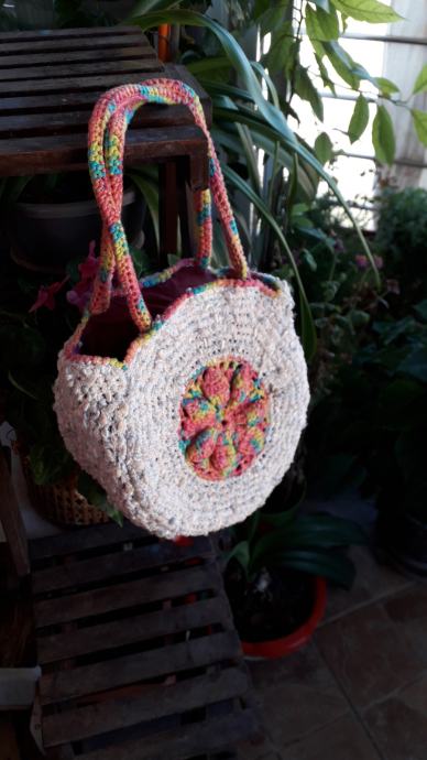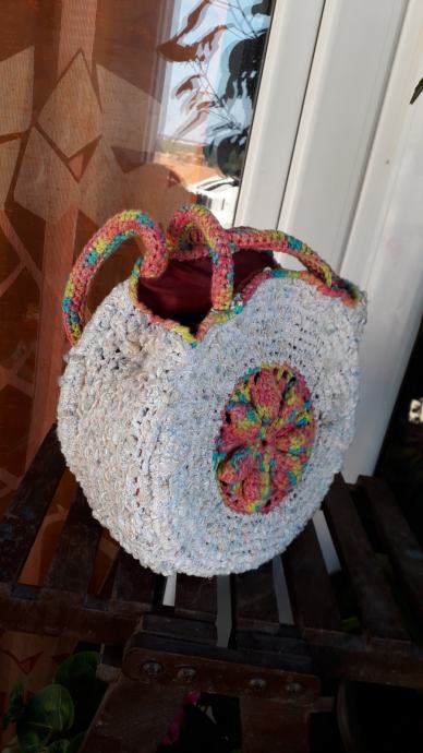 Nova, nekorištena, neobična, manjih dimenzija, ali zbog oblika stane u nju puno stvari. S obje strane je istog izgleda. Podstavljena je, kopčanje je na druker. promjer je 25 cm, širina bočno 12 cm, visina ručki od vrha torbe je 20 cm. Pletena je od pamučnog konca i traka.