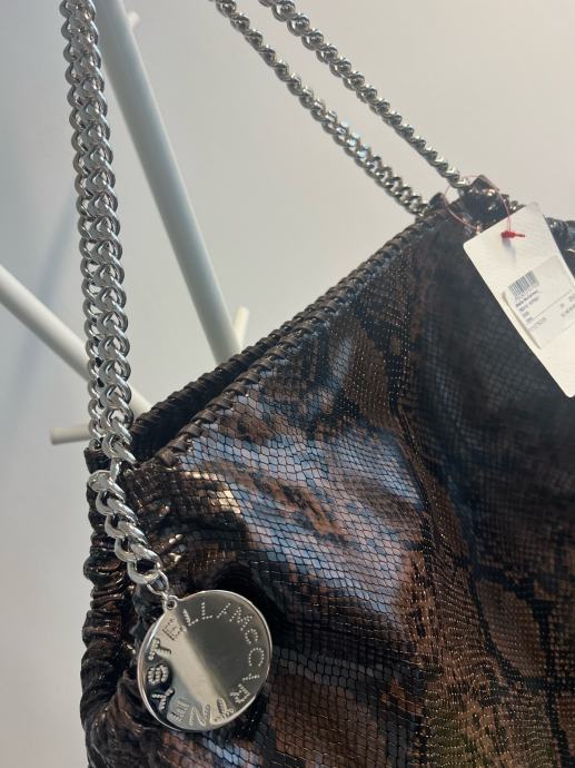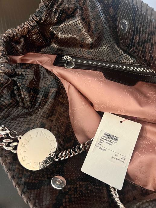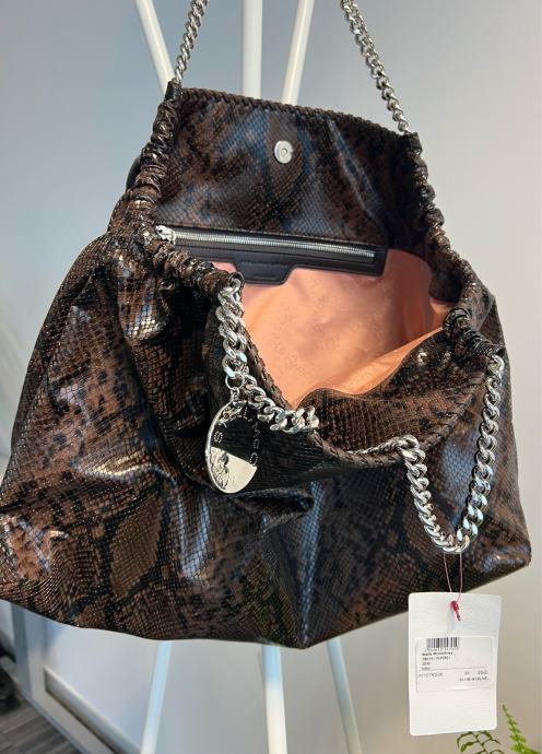 Prodajem novu Stella McCartney Falabella torbicu s etiketom. Radi se o većoj torbici u smeđe-crnoj boji s uzorkom pitona. Ručke su izrađene od karakterističnih srebrnih lanaca po kojima je Falabella model prepoznatljiv, a na lančiću visi okrugli metalni privjesak s natpisom Stella McCartney. Unutrašnjost je roza boje s džepom na zatvarač. Torba je prostrana i mekane konstrukcije.