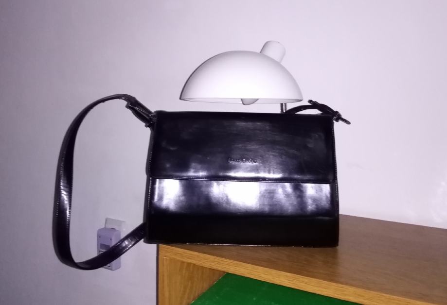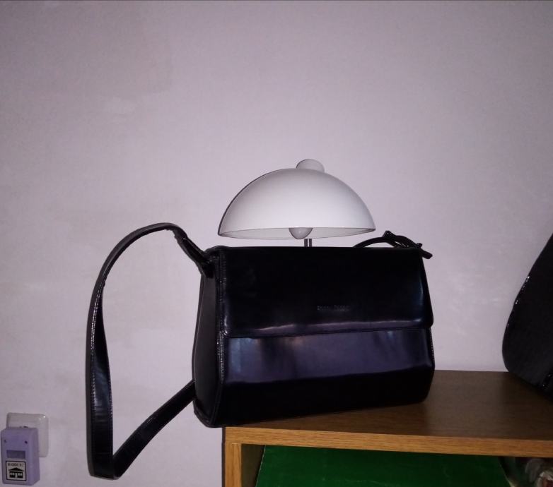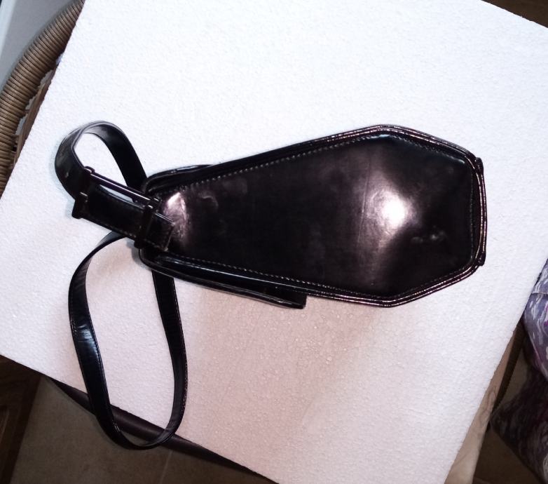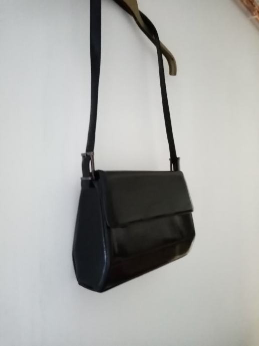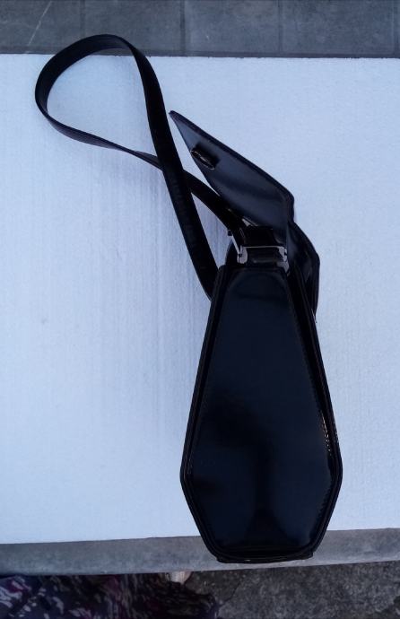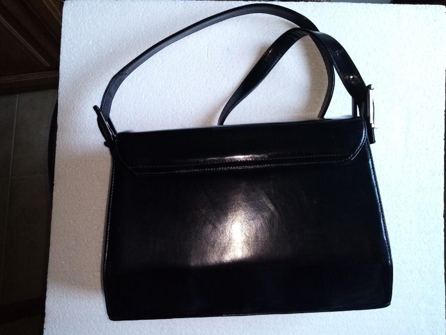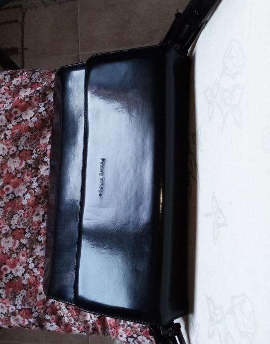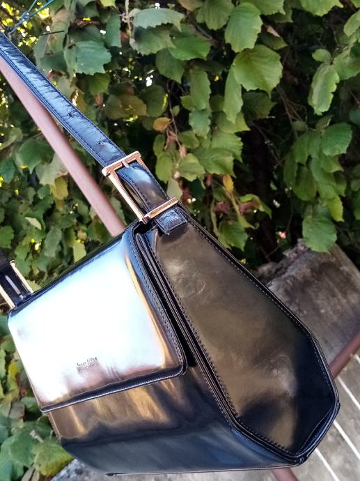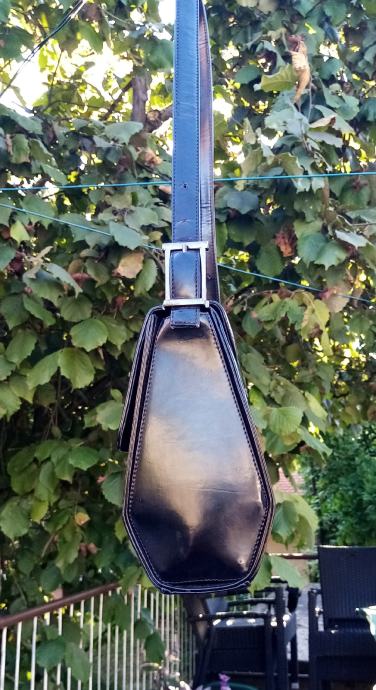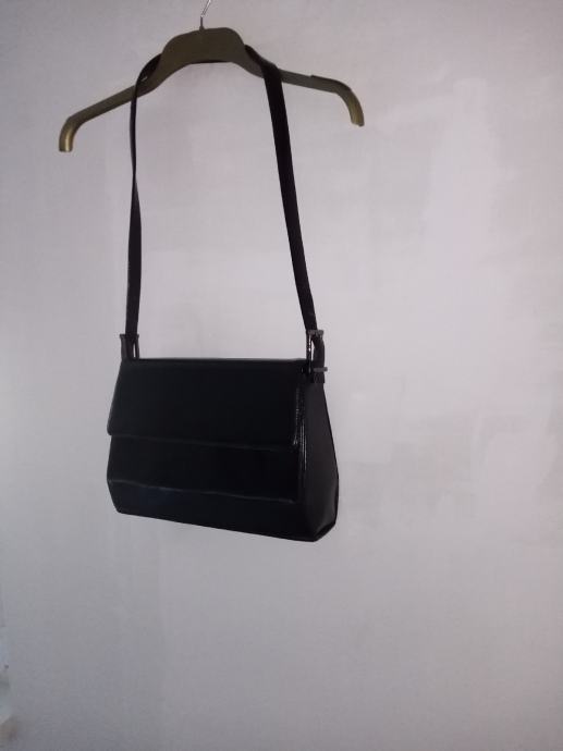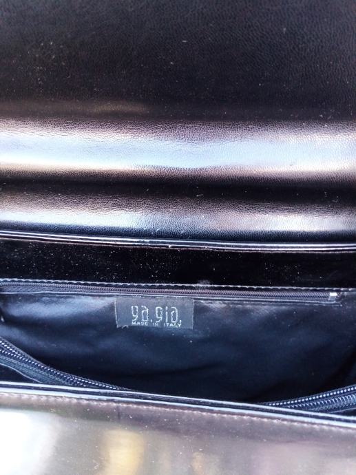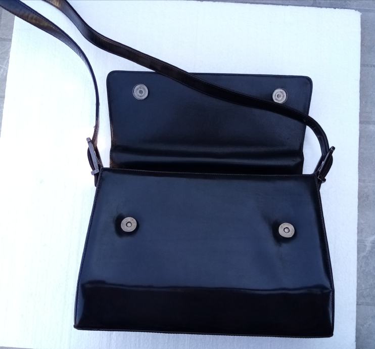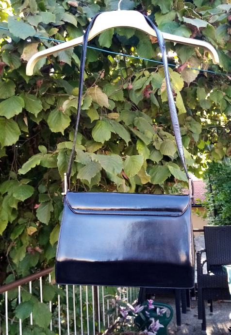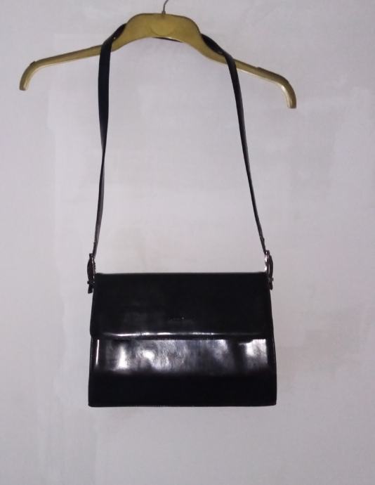 Crna, lakirana, talijanska torbica, srednje veličine: 30x20 cm. Širina na najširem mjestu 10 cm.