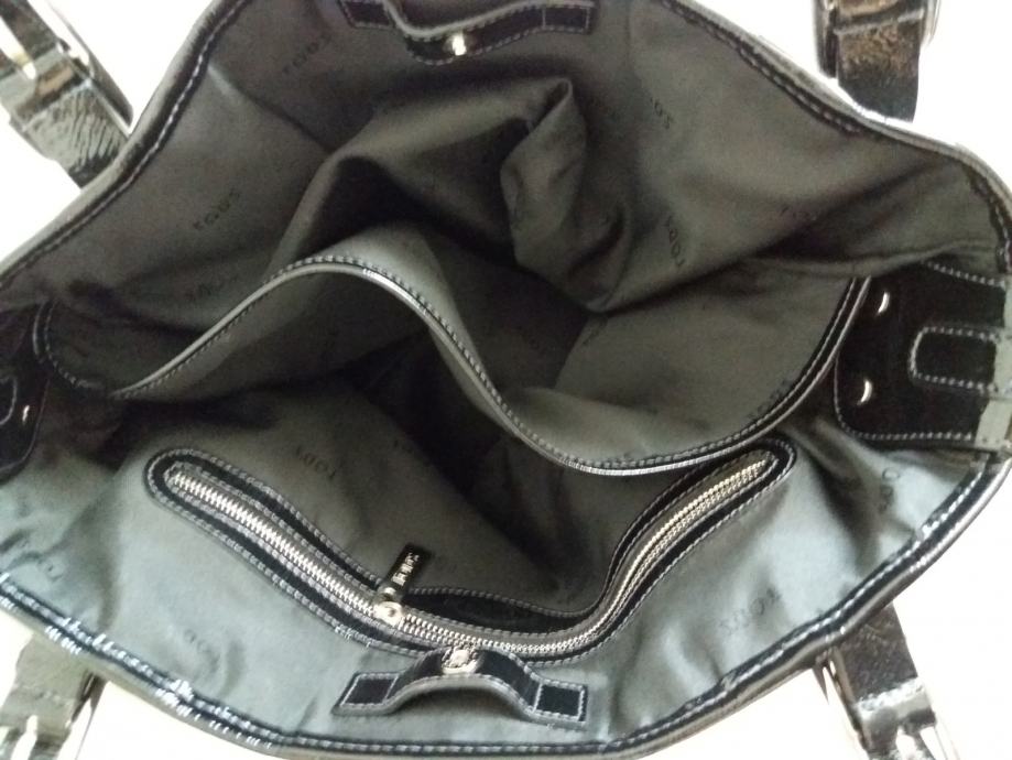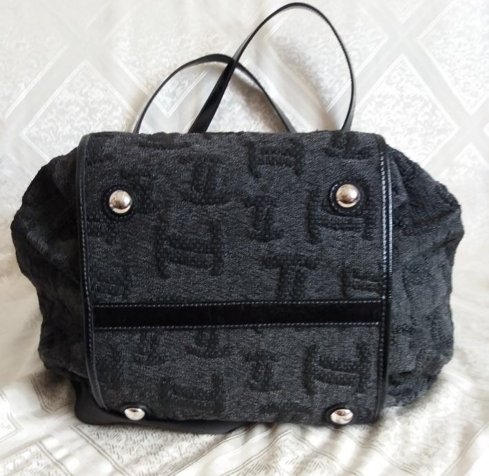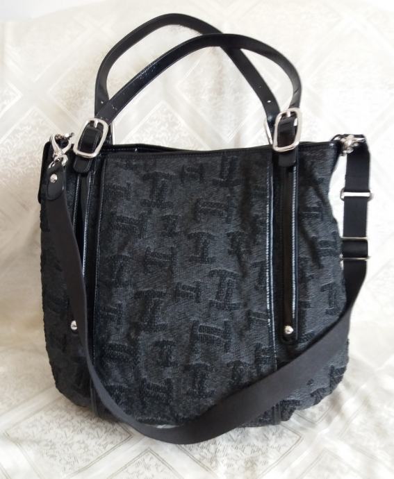 Jako atraktivna torba tamno sive boje , ručke prava lakirana koža crne boje .