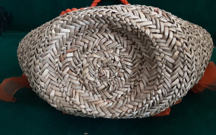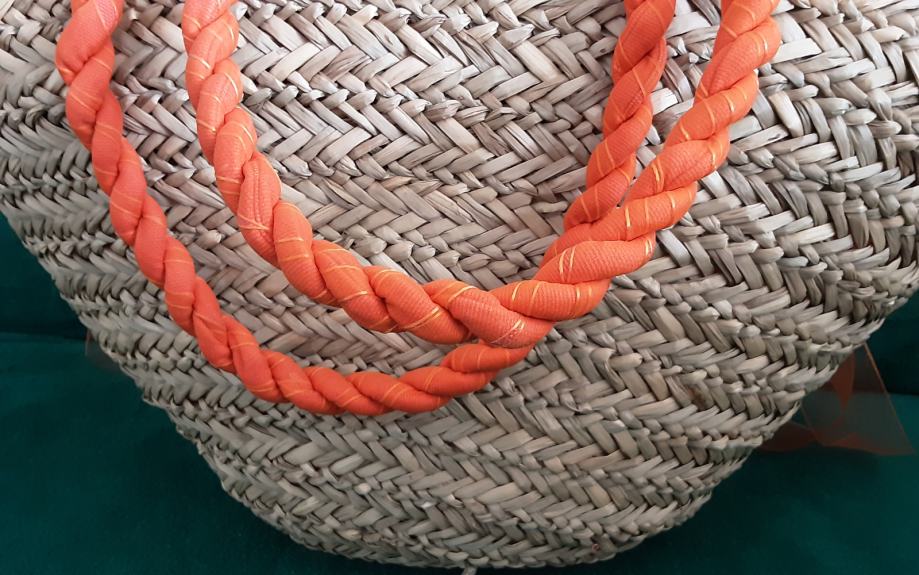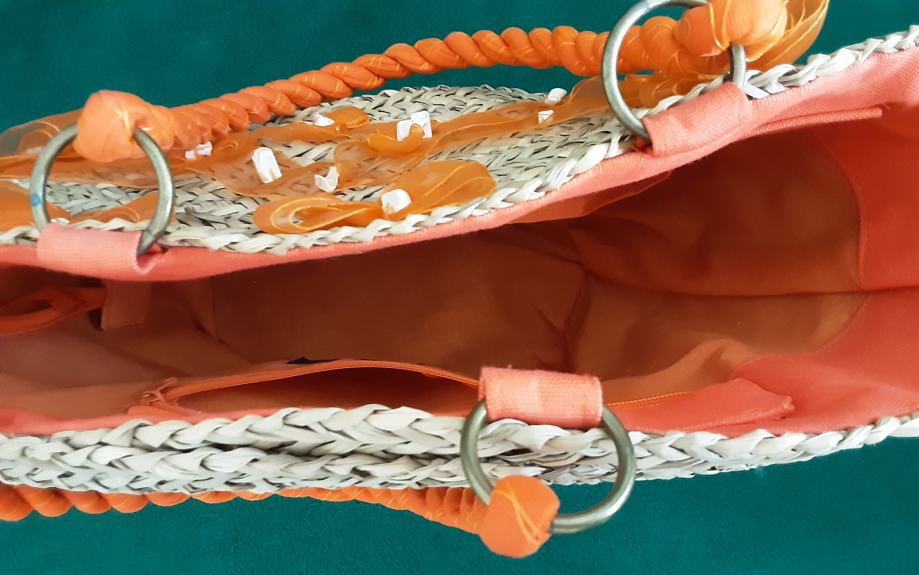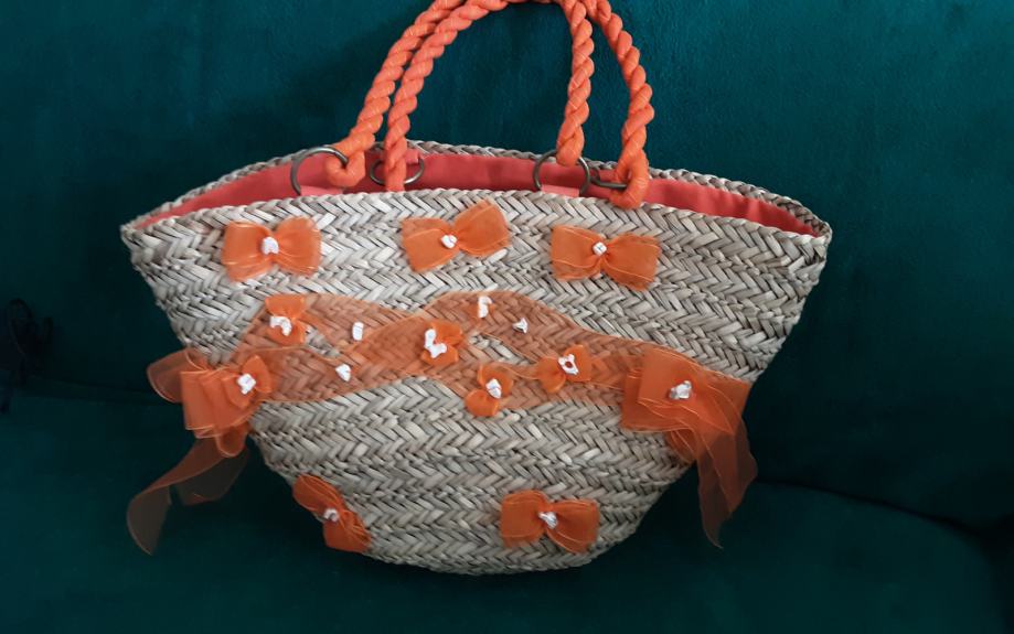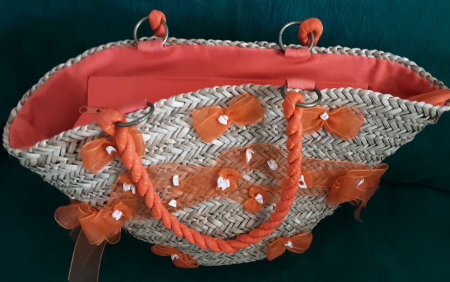 Torba-ceker od slame, krem boje sa narandzastim masnama. Sirina 40 cm, visina 28 cm, dubina 15 cm. Nov i nenosen.