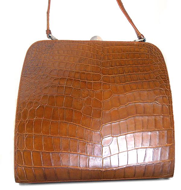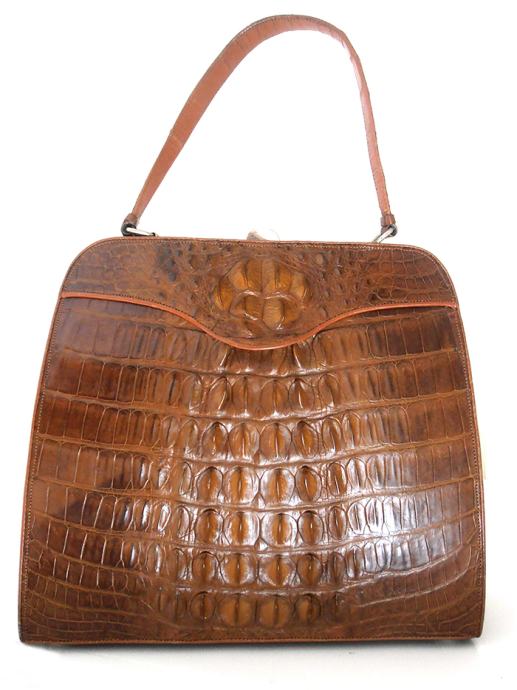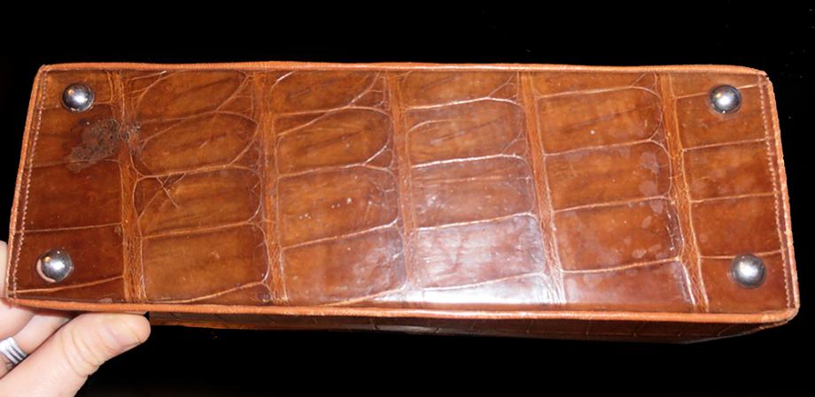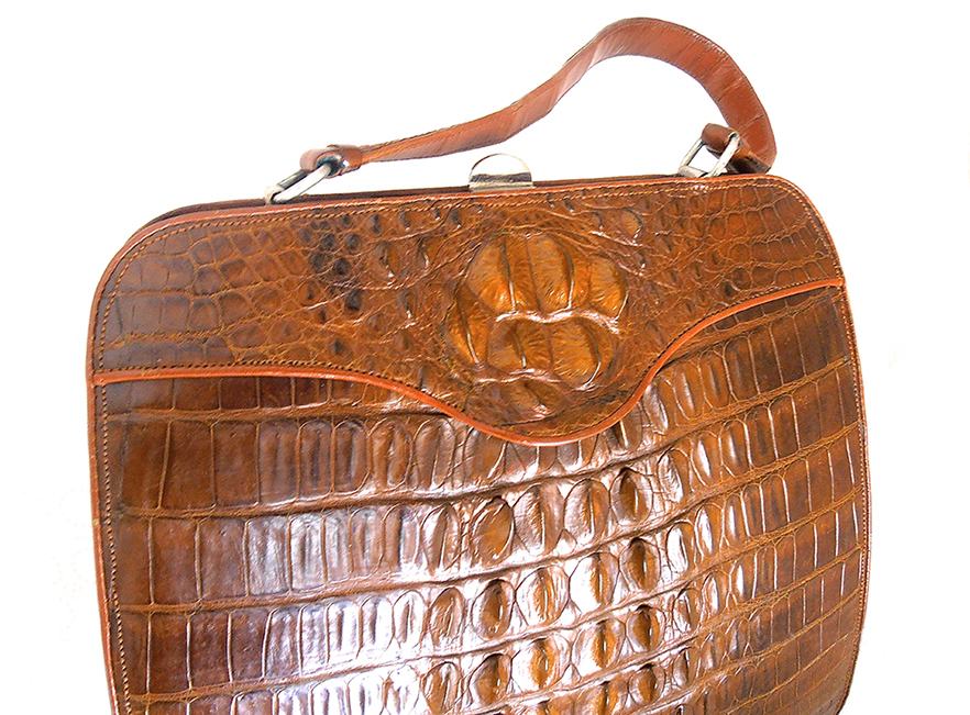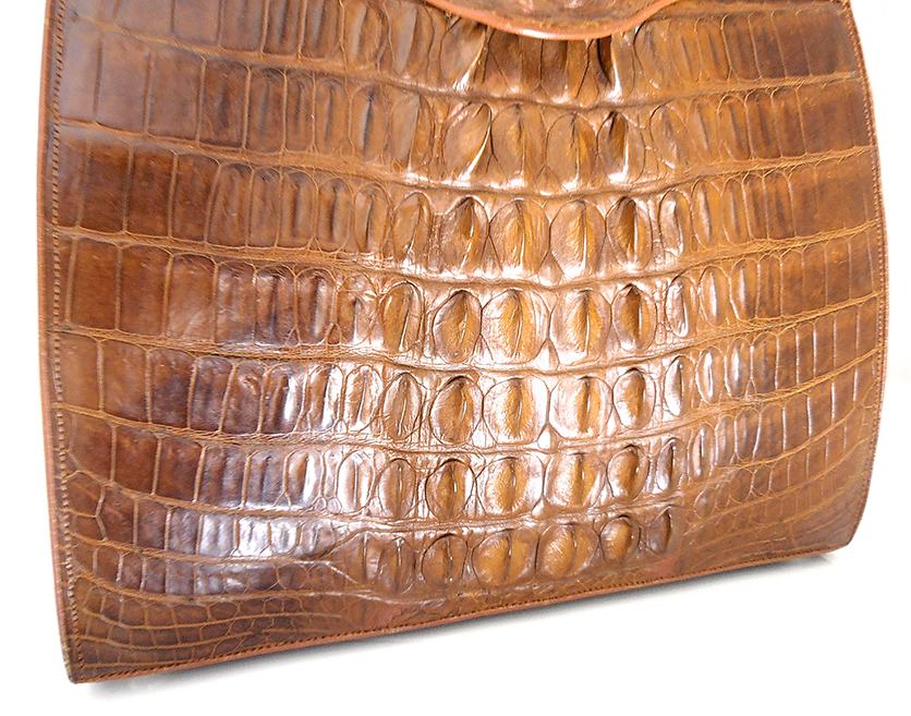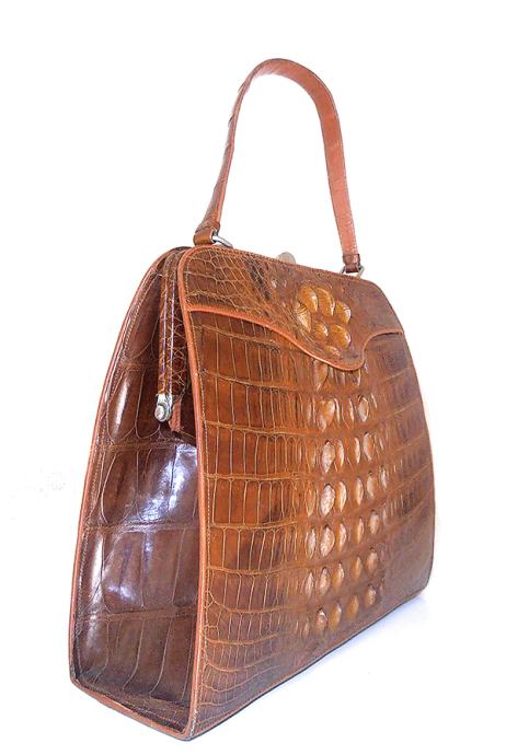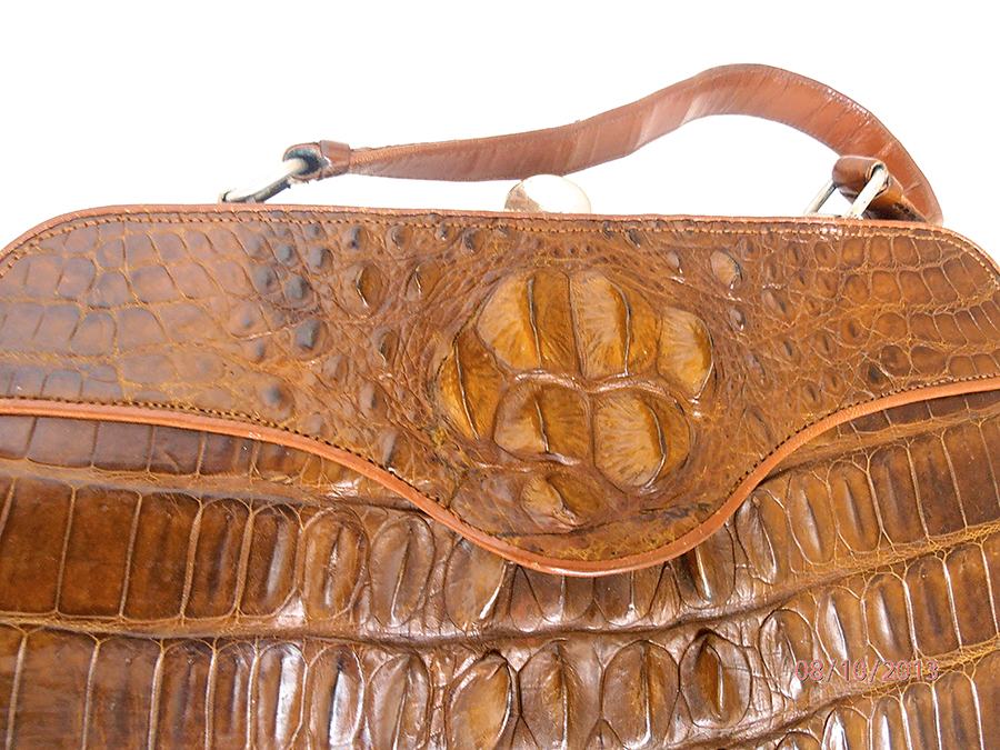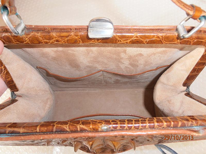 Prekrasna vintage ručna torba iz ’60/70-tih od kože krokodila. Torba u smeđoj boji, izrađena od leđa krokodila, sjajna, izuzetno očuvana izvana i iznutra. Unutrašnjost je izrađena od svjetle velur kože sa obrubima od kože krokodila. Ima i originalan mali novčanik u istoj koži. Osim manje mrlje na donjoj strani (vidljivo na zadnjoj fotografiji ), torba izgleda kao nenošena. Predivna, sjajna, elegantna, unikatna torba prikladna za svaki važnu, formalnu prigodu.