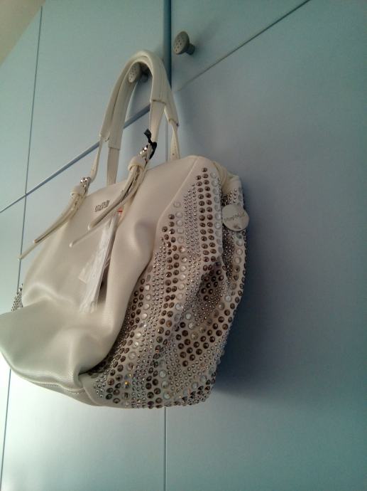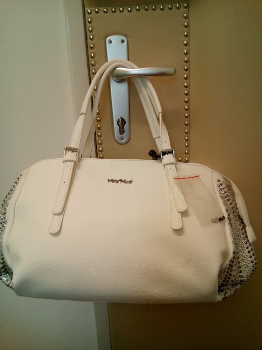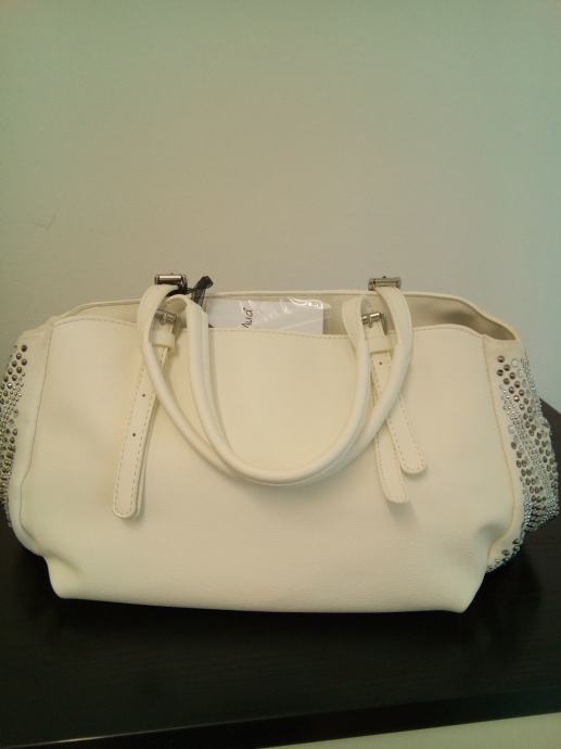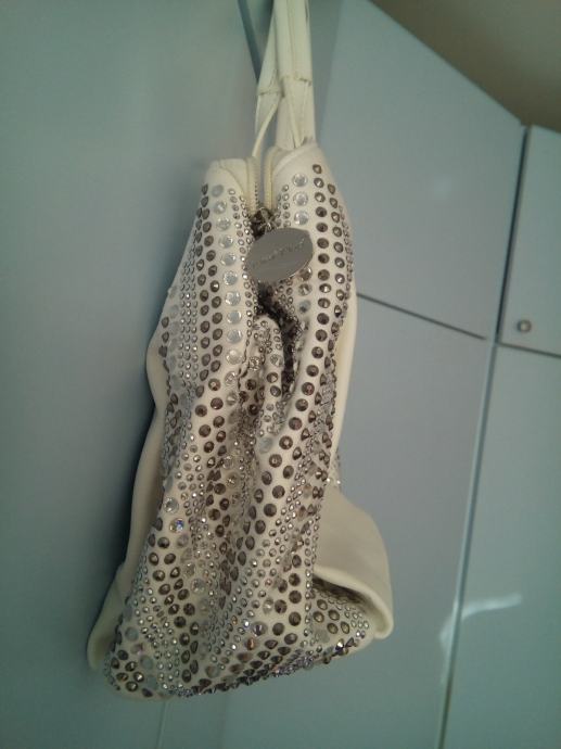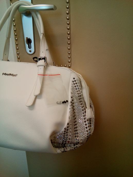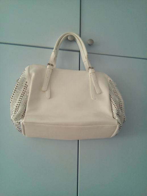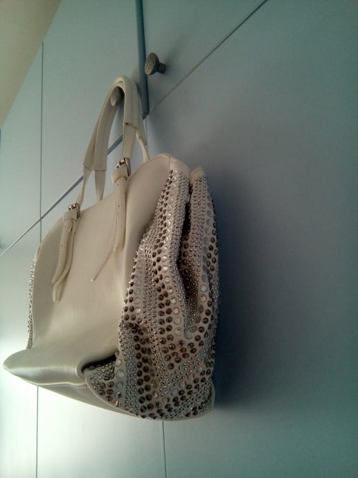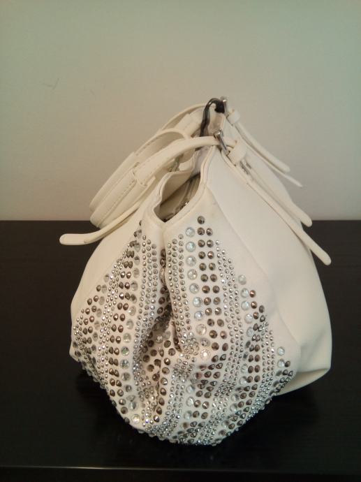 Torba je bijele boje od fine mekane eko kože, ukrašena kamenčićima.