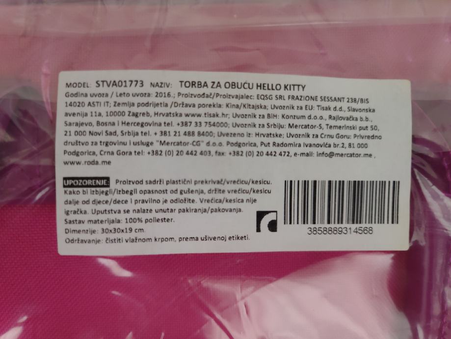 Prodajem TORBU ZA OBUĆU HELLO KITTY- 2 KOMADA
