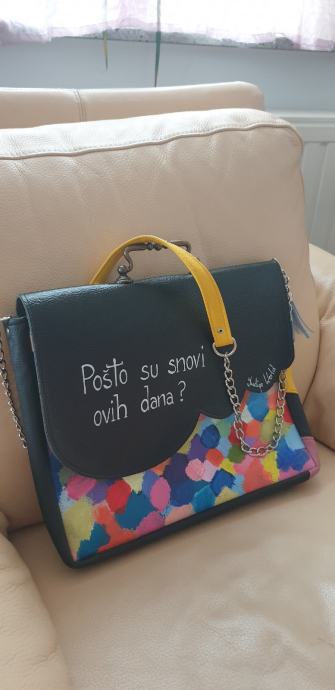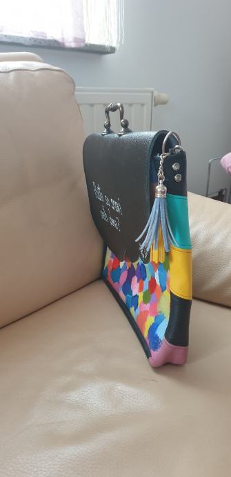 Unikatno izrađena i oslikana torba dimenzija cca 30×25×5. Materijal je eko koža s metalnim dodacima. Ima malu ručkicu za nositi u ruci i veliku za nositi preko ramena. Nikada korištena!
