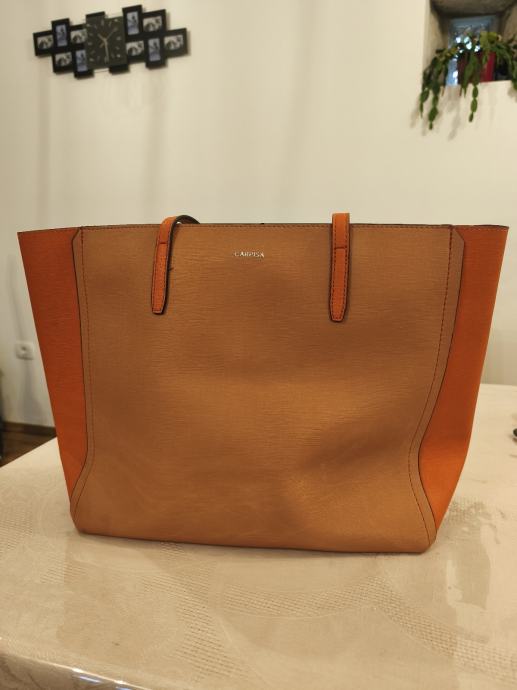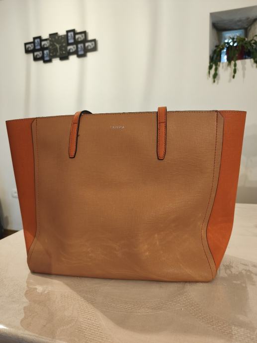Prodajem Carpisa torbicu u smeđim i narančastim tonovima. Prostrana shopping torba s dvije ručke za nošenje preko ramena. Dvobojni dizajn kombinira svjetliju narančastu sredinu s narandžastim detaljima na stranicama i ručkama. Praktična za svakodnevnu upotrebu. U kutu ima malu mrlju koja se kod nošenja ne vidi. Slika