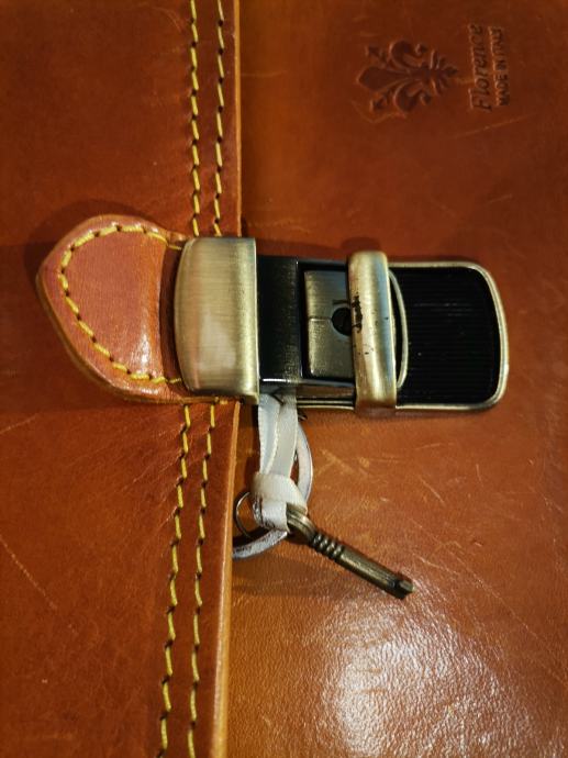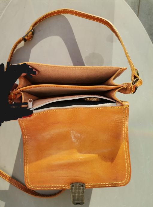 Prodajem elegantnu kožnu torbicu u lijepoj smeđoj boji s dekorativnim šavovima i zlatnim zatvaračem. Torbica je malo nošena i u odličnom stanju, s dugim remenom za nošenje preko ramena. Vidljiv je prepoznatljivi logo na prednjoj strani što potvrđuje kvalitetu izrade.