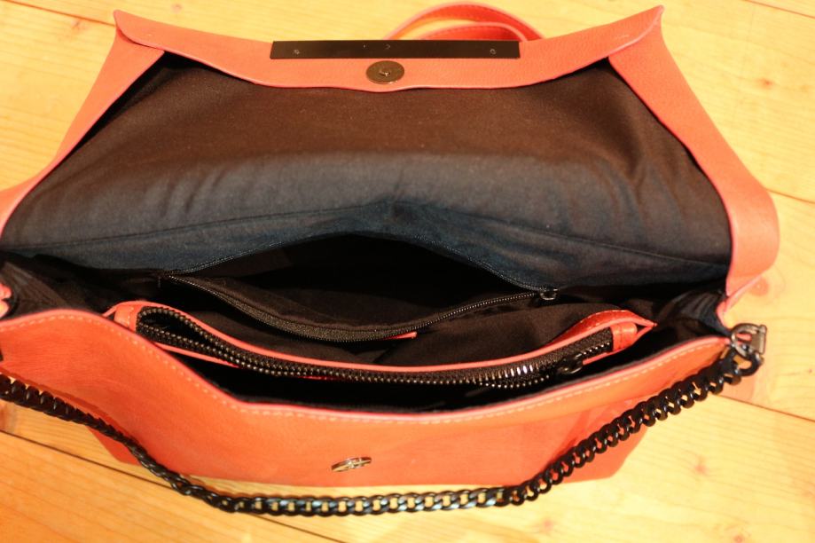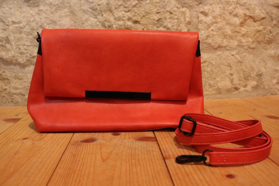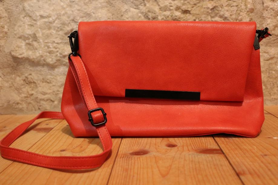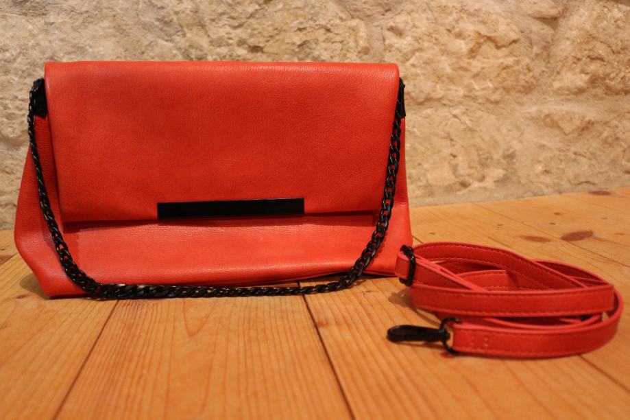Crvena torbica, dobro očuvana. Može se nositi preko ruke ili preko ramena. 3 pretinca, srednji s patentom.