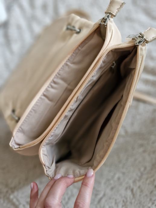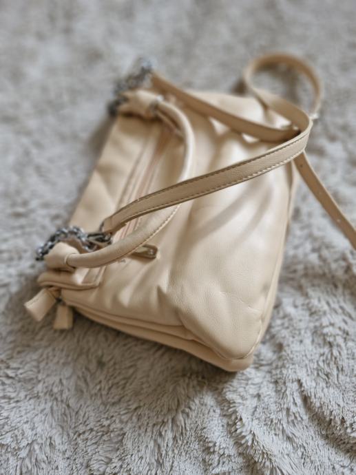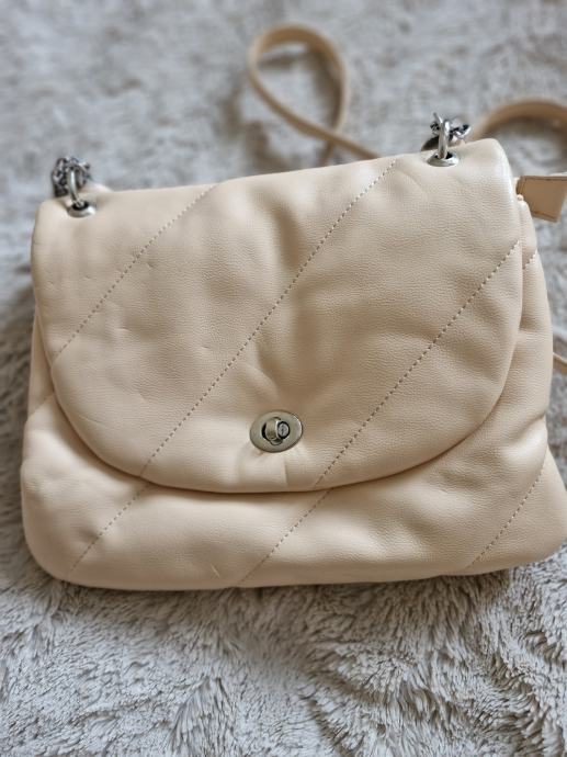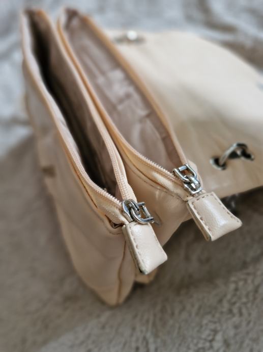 Elegantna bež torbica s prošivenim detaljima i srebrnim lancem za nošenje preko ramena. Rabljena ali dobro očuvana, s praktičnim pretincima iznutra. Savršen modni dodatak za svakodnevne kombinacije.