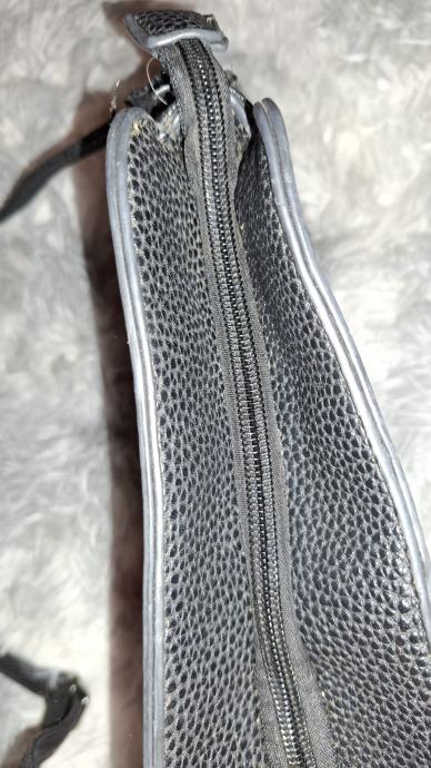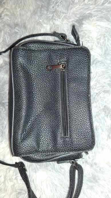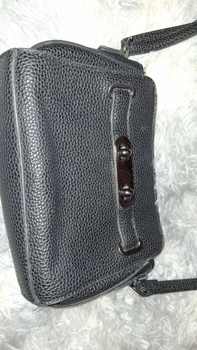 Prodajem manju torbicu u crnoj boji s dugim naramenicama za nošenje preko ramena. Torbica ima strukturirani oblik s karakterističnim detaljima - dekorativne kopče na prednjem dijelu i praktičan zip zatvarač. Materijal podsjeća na zrnatu kožu ili imitaciju kože. Kompaktnih je dimenzija, praktična za svakodnevnu upotrebu ili izlaske kada ne treba nositi puno stvari.