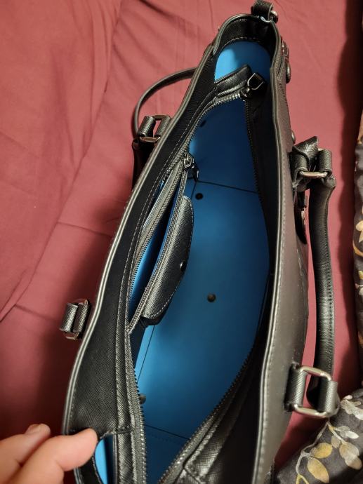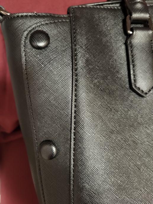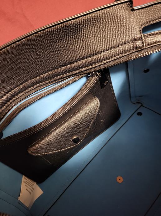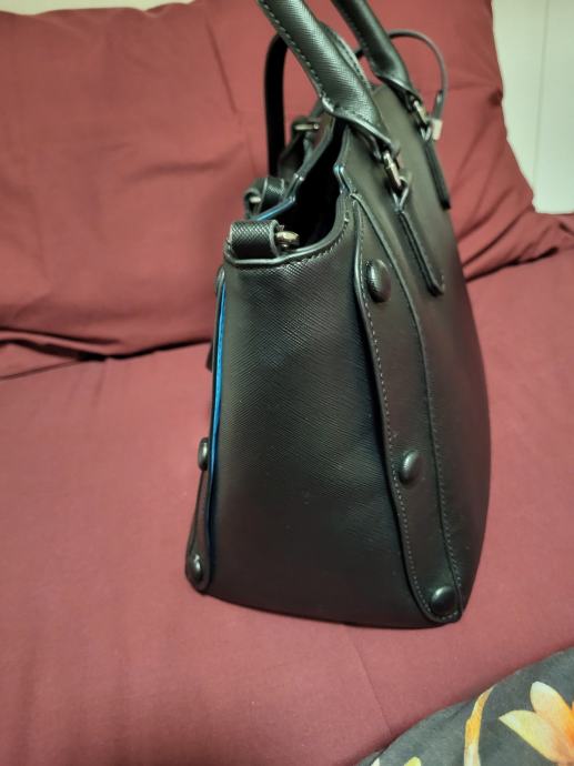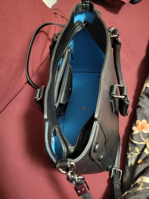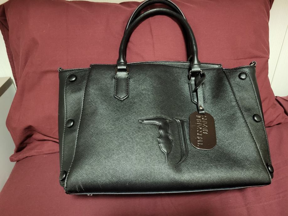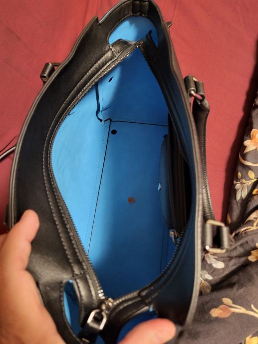 Original Trussardi Jeans crna torba, velika, može biti poslovna, kao i za na fakultet, šetnju, posao. Unutra plavi eko materijal. Ima i dugi remen za preko ramena/tijela i patent zatvarac. Dva mala pretinca unutra se mogu skinuti i poslužiti kao novcanik. Nosena uz ostale torbe kratko, sprijeda ima dvije plitke ogrebotine. Dok se nosi, nisu vidljive. Čista i uredna. Vrlo dobro stanje!