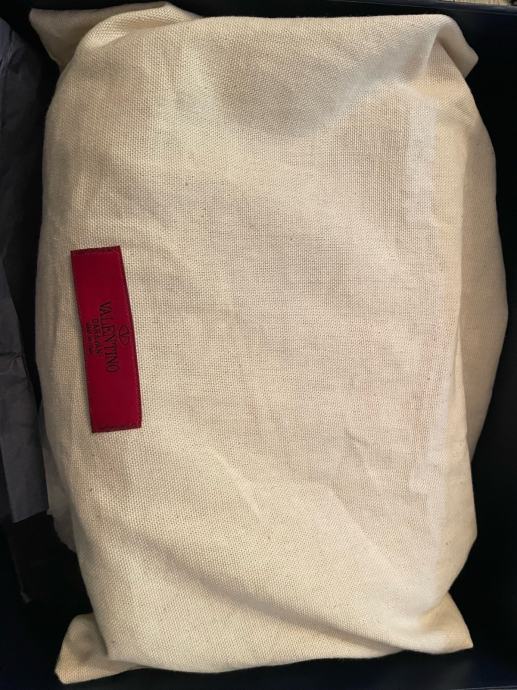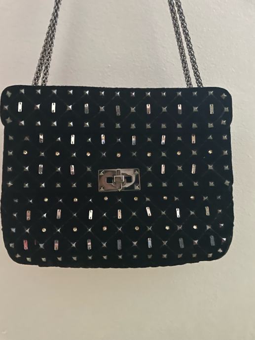 Prodajem original Valentino torbu, rabljenu, ali vrlo očuvanu. Torba je crne boje, izrađena od baršuna, ukrašena srebrnim zakovicama i detaljima, s prepoznatljivim Valentino dizajnom. Ima metalni lanac za nošenje preko ramena i elegantnu metalnu kopču sprijeda. Dobivena je na poklon, no rijetko nošena i bez vidljivih oštećenja.