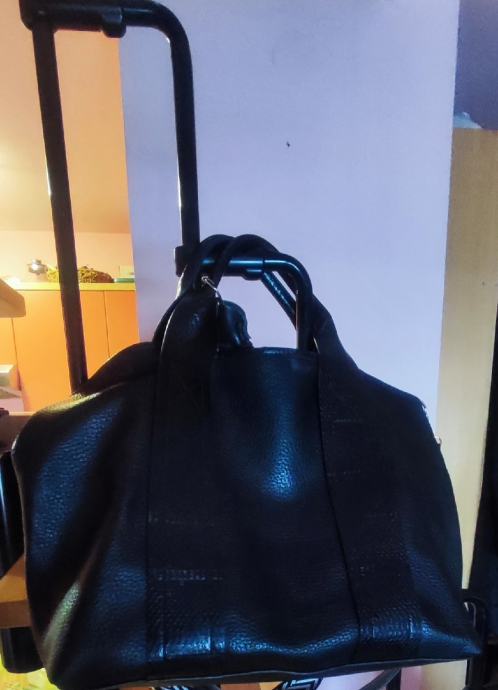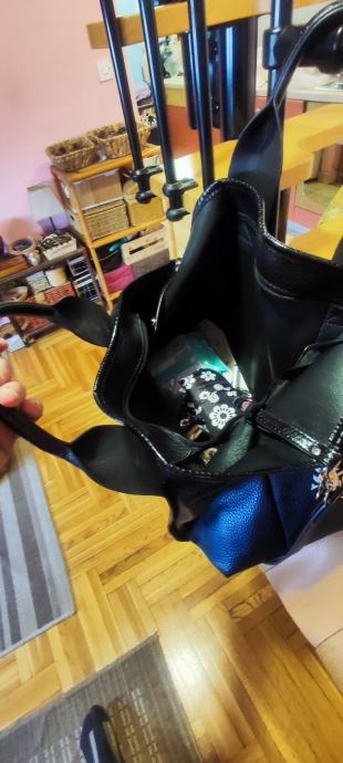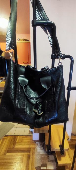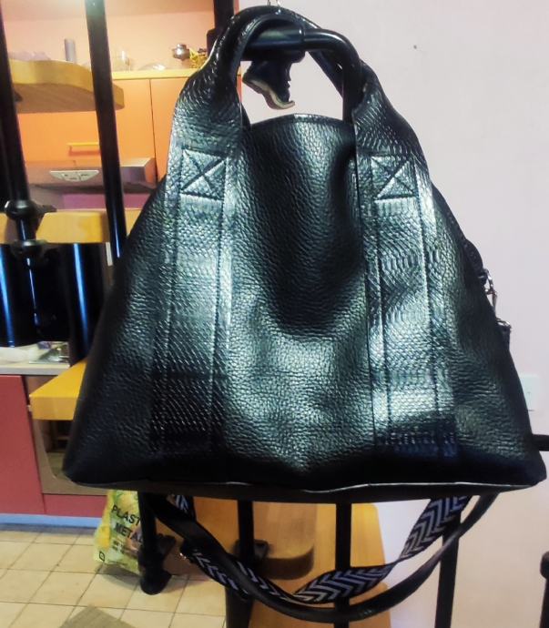 Velika torba crne boje s čvrstim ručkama i dugačkim remenom. U sklopu nje je i unutarnja torbica koja se može nositi samostalno. Torba se kopčanjem na druker pretvara u manju, ili se bez kopčanja nosi kao velika. Kvalitetna talijanska eko-koža.