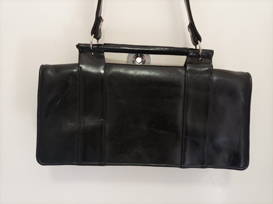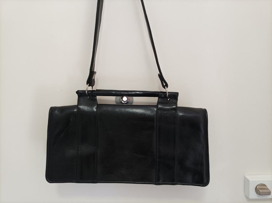 Vintage kožna torba 60-ih. Zanimljiv dizajn, pravokutni oblik i predivne ručkice. Dovoljno duga ručka za na rame. Blaga oštećenja koje i priliče godinama iz kojih potječe. ))) Dimenzije 39 x 19 cm.
