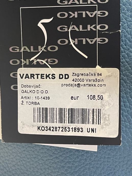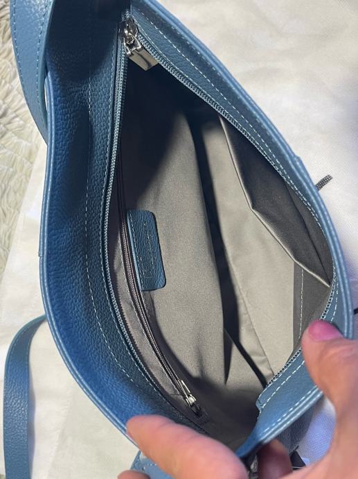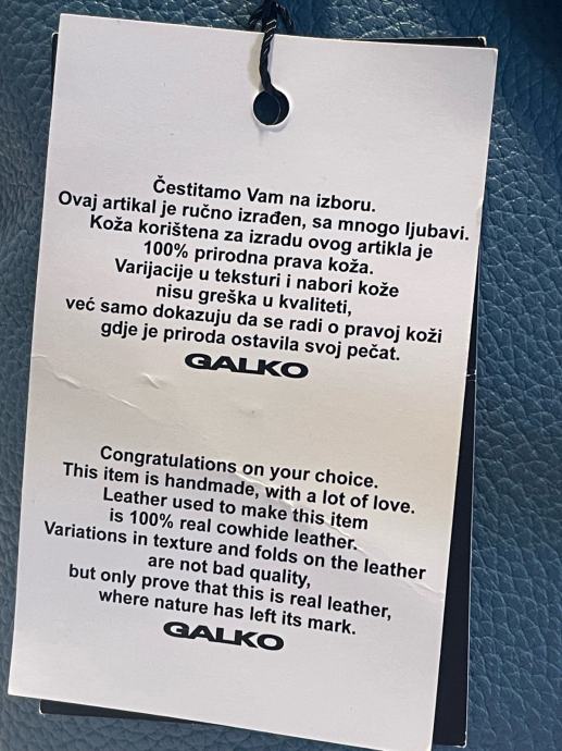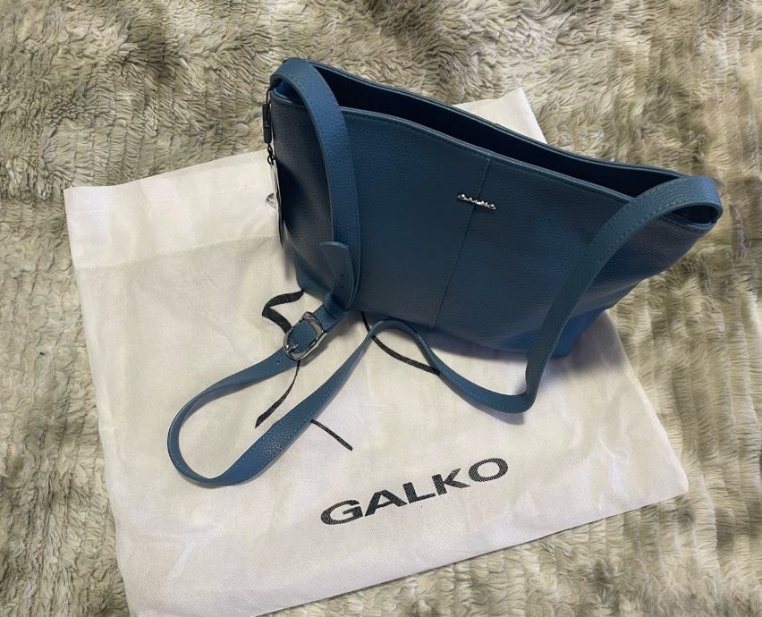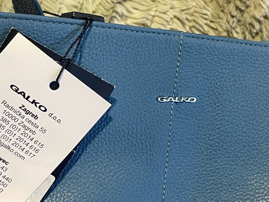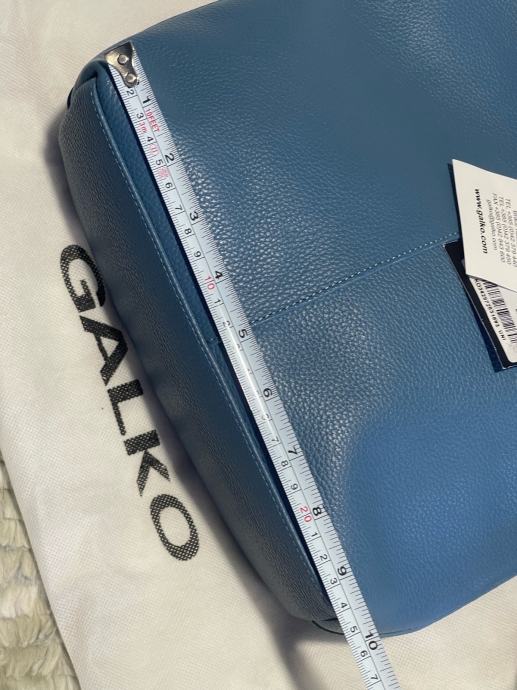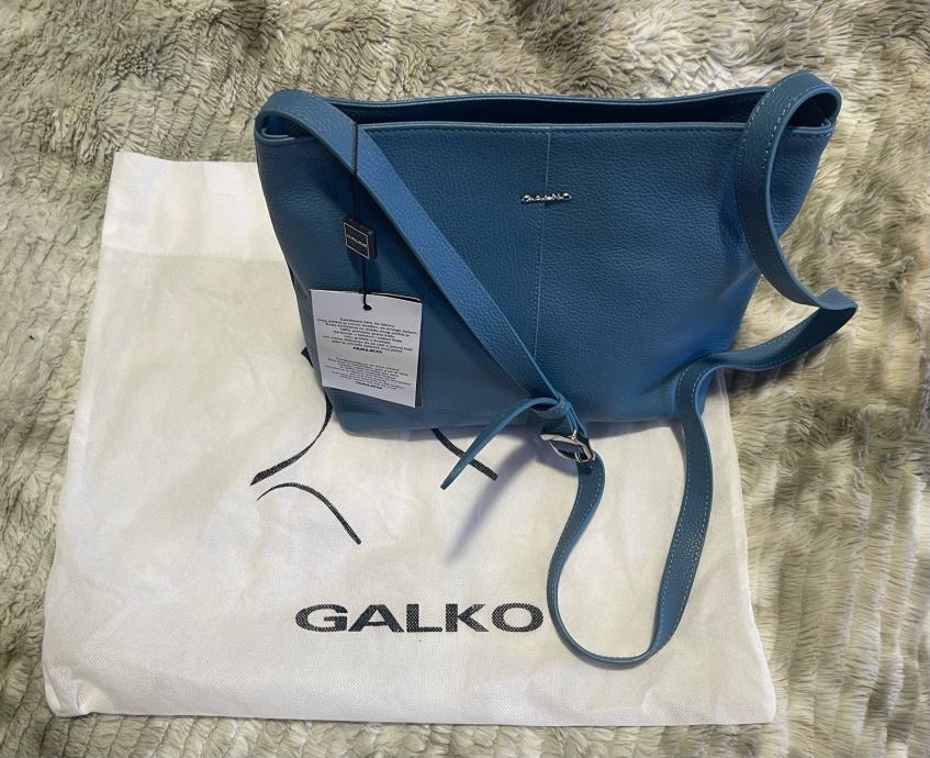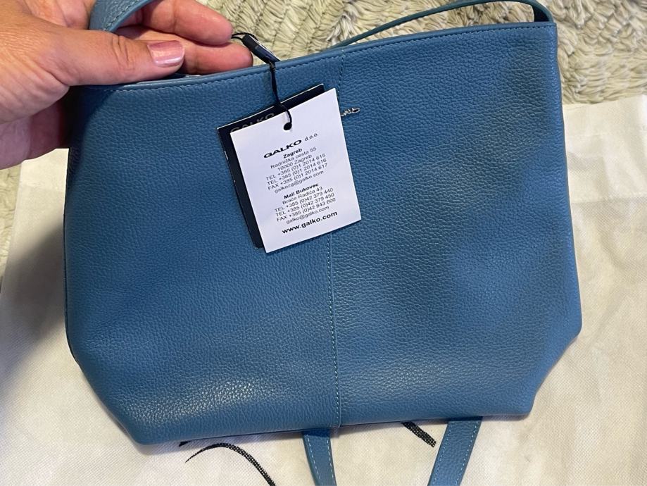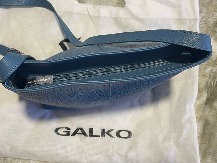 Nova s etiketom kožna torba Galko. Patent zatvaranje, unutra džepići. Lijepa plava boja, podesivi remen. Veličina 24x24x9cm. Ima svoju platnenu vrećicu za zaštitu kod spremanja u ormar.