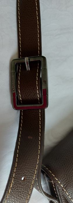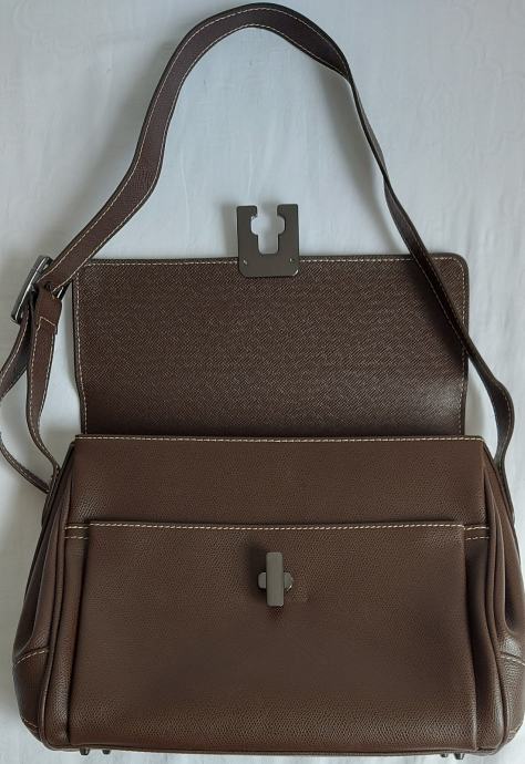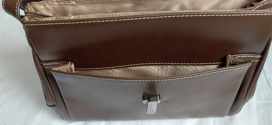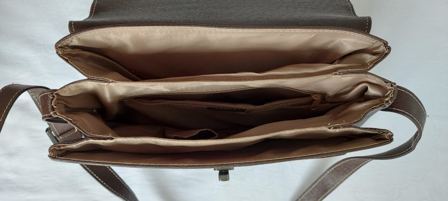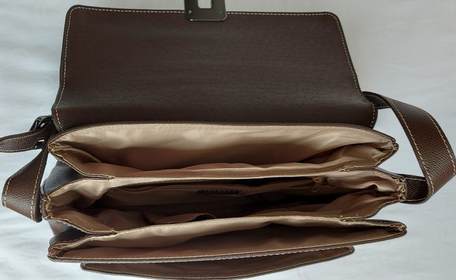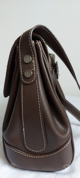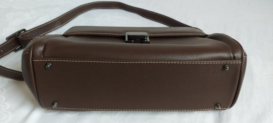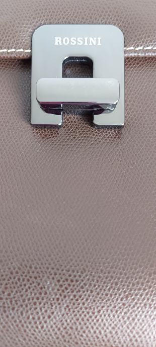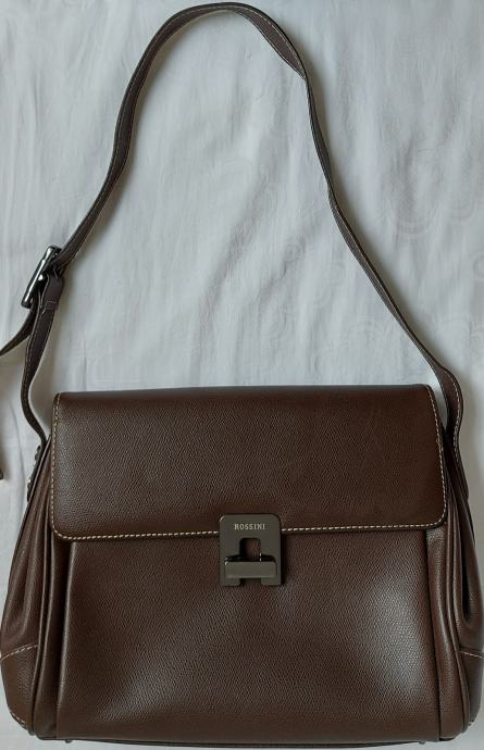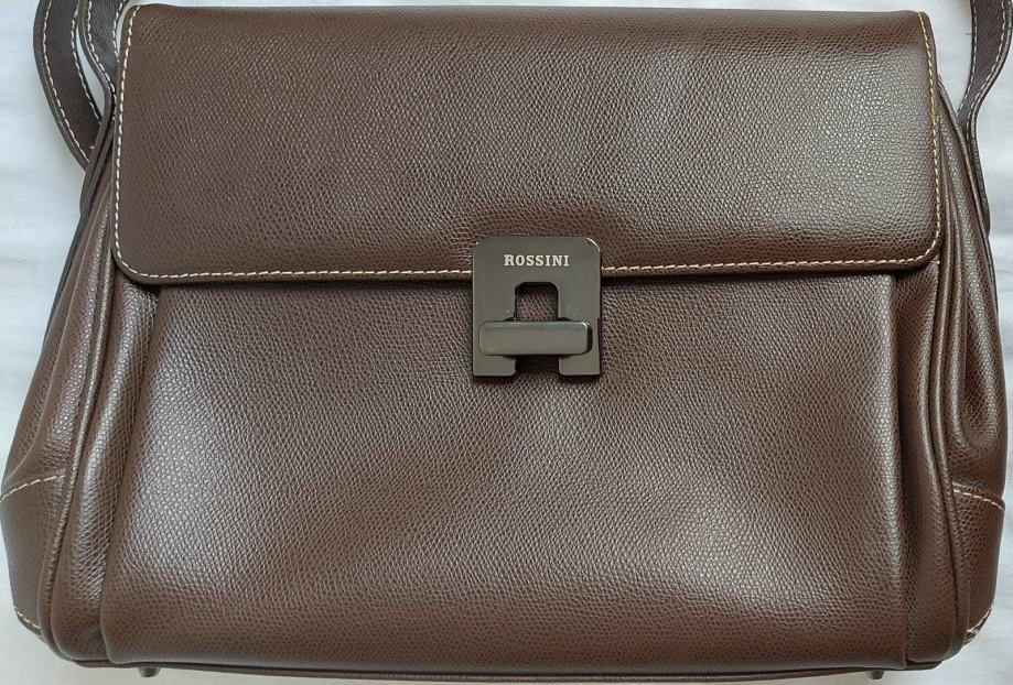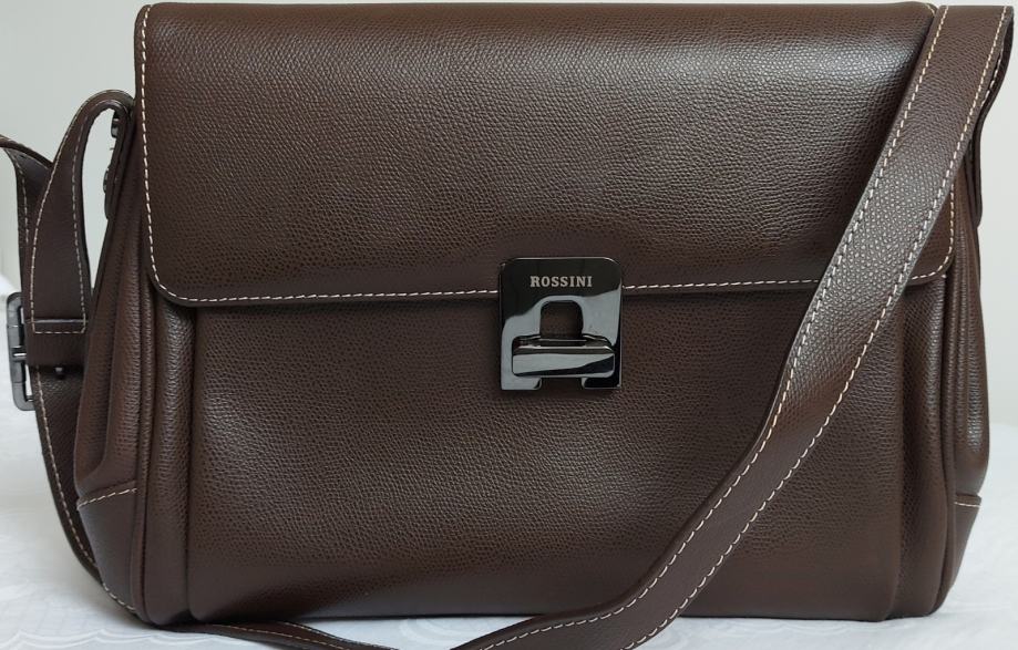Prodajem torbu marke Rossini, izrađena u Italiji, klasična, kompaktna, čvrsta a opet ugodna i praktična za upotrebu. Napravljena od prave, malo deblje kože, smeđe/čololada boje. Ima podesivi remen za na rame ili kad se smanji za nošenje u ruci, nema klasične ručke. Torba ima čvrsto dno, veliki vanjski džep, unutrašnjost se sastoji od tri pretinca s jednim velikim džepom koji ima patent zatvarač i džepom za mobitel.Torba je nova, nenošena, bez oštećenja. Dimenzije: širina 32 cm, visina 25 cm, dno torbe je široko 11 cm. Ručka je dužine cca 75 cm.