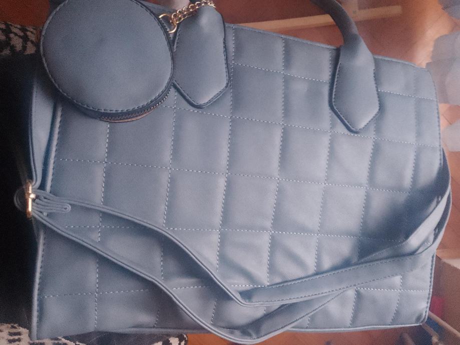 Nova , nekorištena elegantna i moderna veća ženska prošivena poslovna ili casual torba s mini novčanikom , sivoplava / boja leda. Puno ljepša uživo. Ima unutarnje razdvojene pretince, vanjski džep, unutarnje džepiće i mali novčanik za kovanice ili ključeve. Dugi remen i kraće ručke. 13 eura + poštarina ili osobno preuzimanje.