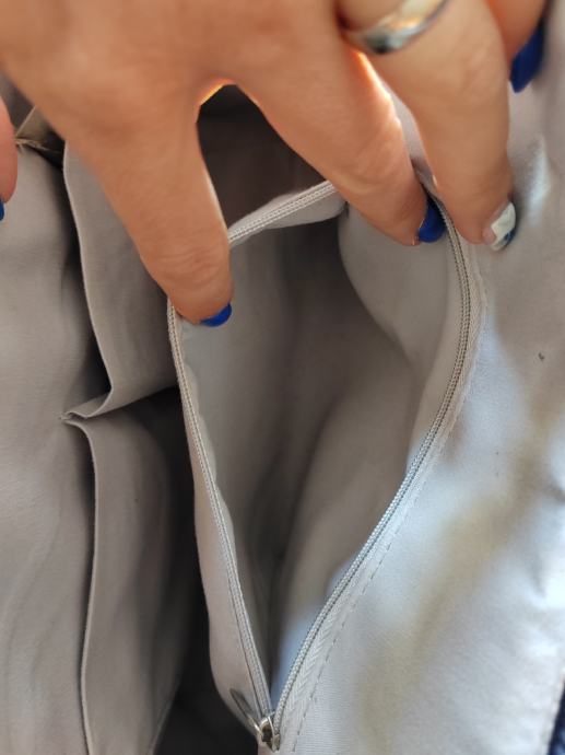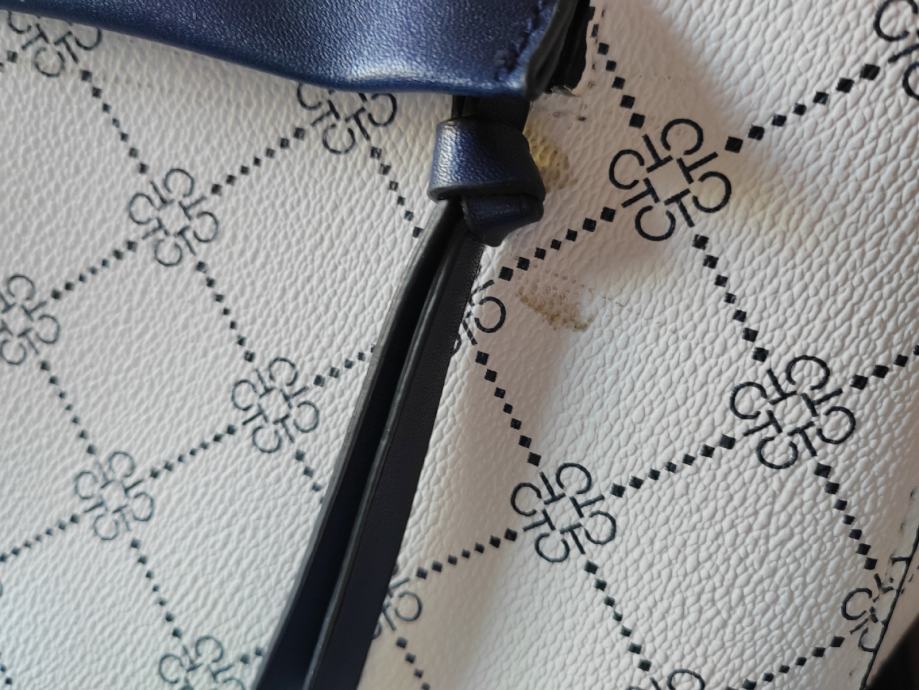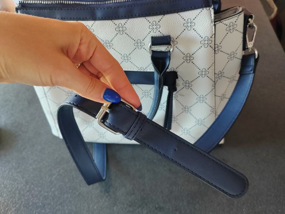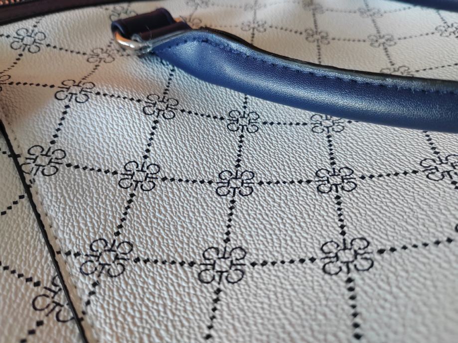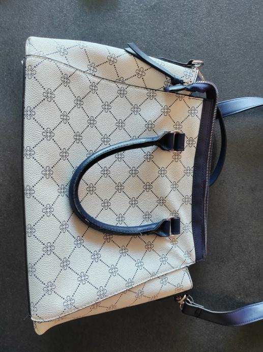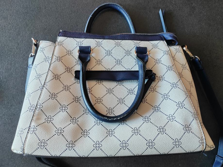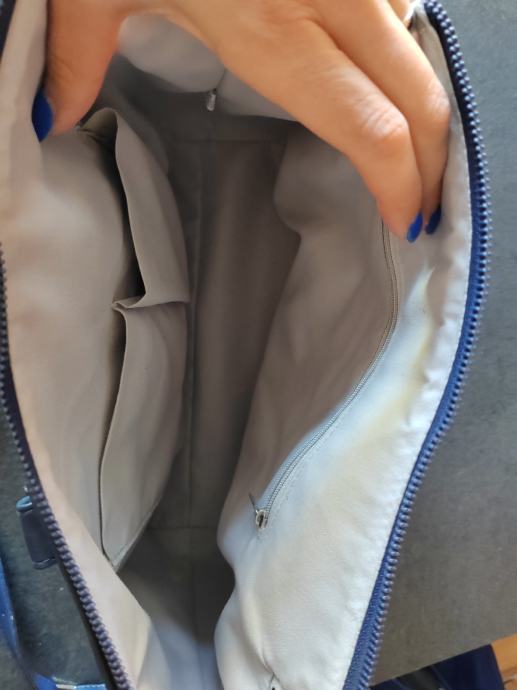 Ima dvije kraće crne ručke i jednu dugačku. Unutrašnjost očuvana. Ima manji pretinac s unutrašnje strane + 2 džepića za mobitele. Ima vanjski mali pretinac sa stražnje strane.