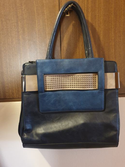 Ženska torba, plava, više pretinaca, veličina cca 30×30 cm