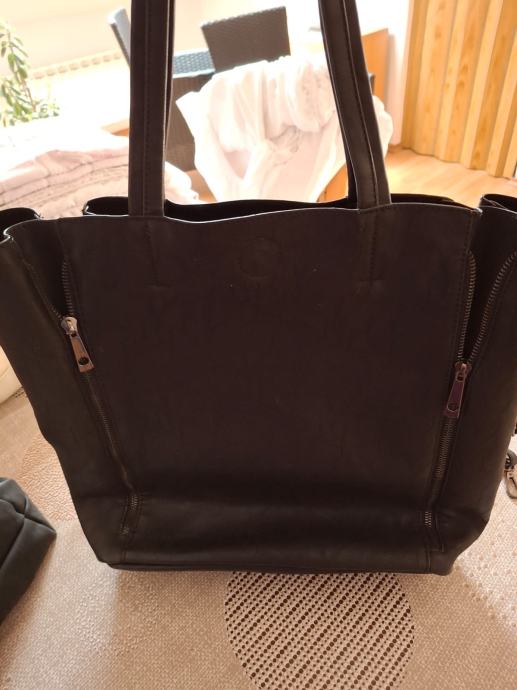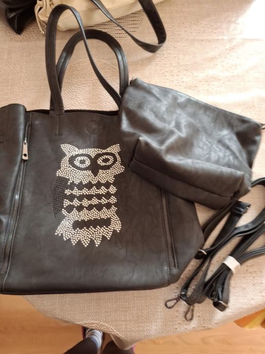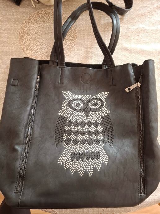 Prodajem elegantnu crnu žensku torbu s dekorativnim uzorkom sove od svjetlucavih zakovica, u novom stanju bez etikete. Prostrana torba ima praktične ručke i bočne zatvarače za dodatnu funkcionalnost. Dolazi s manjom torbicom koja se može koristiti zasebno ili kao dodatni pretinac unutar glavne torbe.
