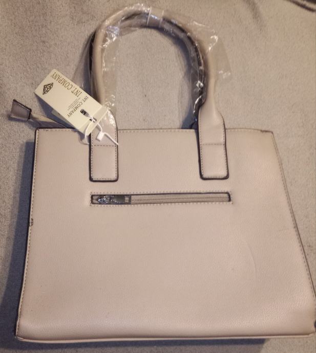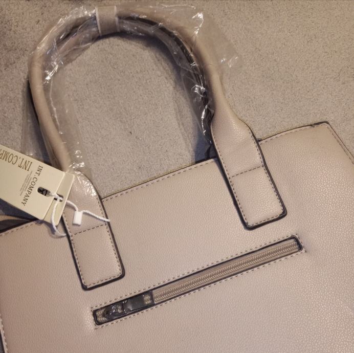 Elegantna ženska torba u bež boji, potpuno nova s etiketom. Torba ima praktične ručke i dekorativne detalje s metalnim elementima koji joj daju moderan izgled.