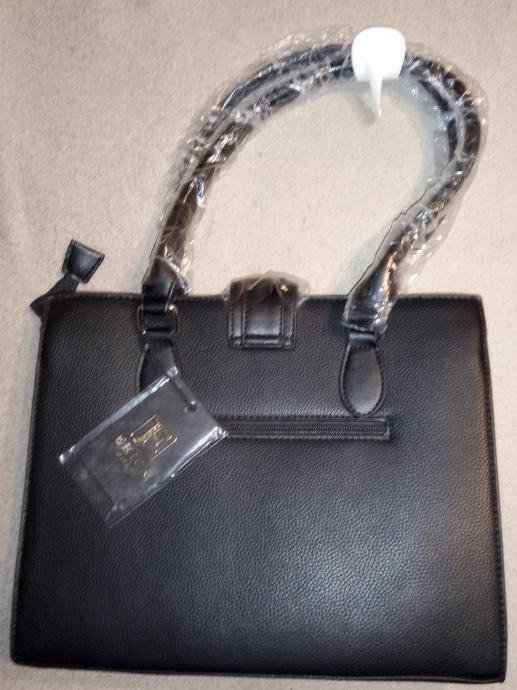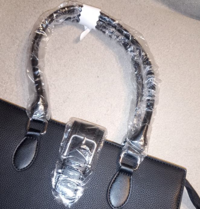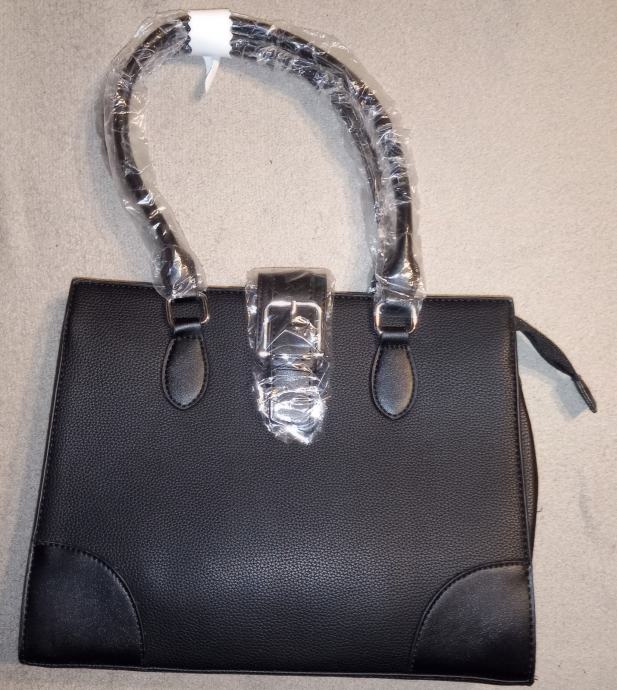 Elegantna ženska torba u crnoj boji, potpuno nova s etiketom. Klasičnog je dizajna s metalnim detaljima i praktičnim ručkama koje su još zaštićene folijom.