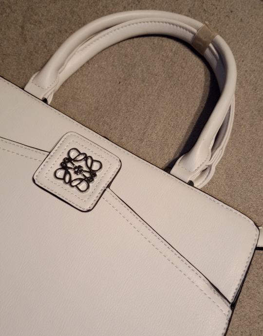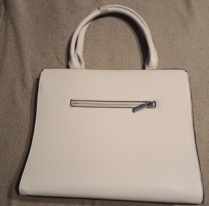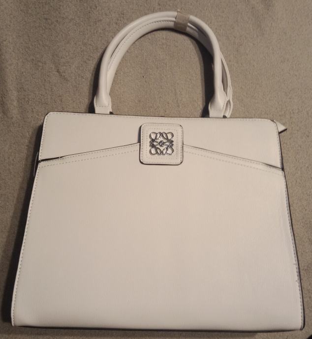 Prodajem elegantnu bijelu žensku torbu s dekorativnim metalnim logom, potpuno nova s etiketom. Klasičnog je dizajna s praktičnim ručkama i stražnjim zatvorenim džepom.