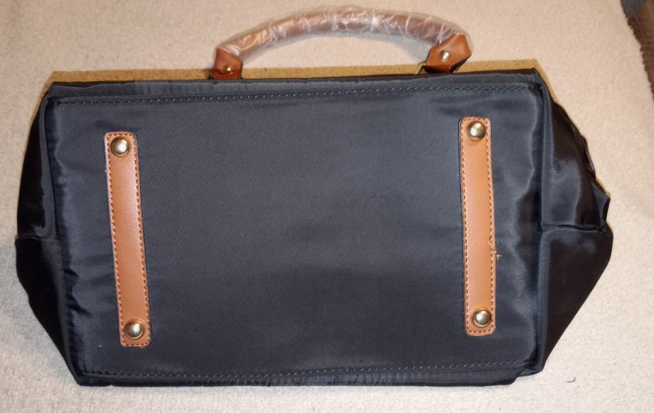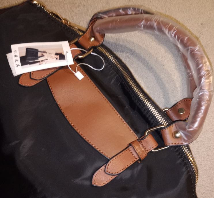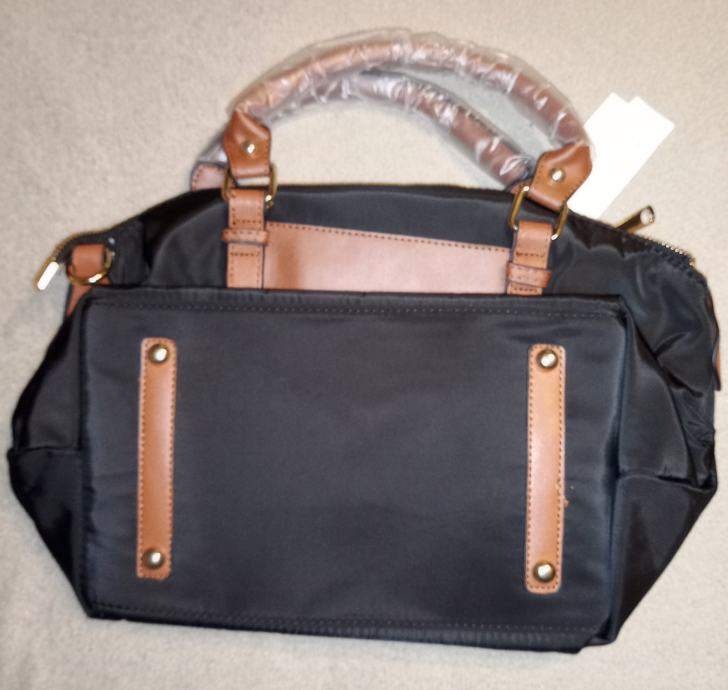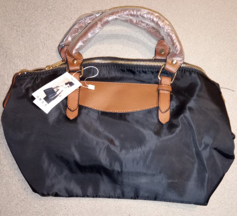Elegantna ženska torba u crnoj boji s dekorativnim smeđim detaljima, potpuno nova s etiketom. Prostrana torba s funkcionalnim zatvaračem idealna je za svakodnevnu upotrebu i posebne prilike. Moderan dizajn i kvalitetna izrada čine je savršenim modnim dodatkom za svaku garderobu.